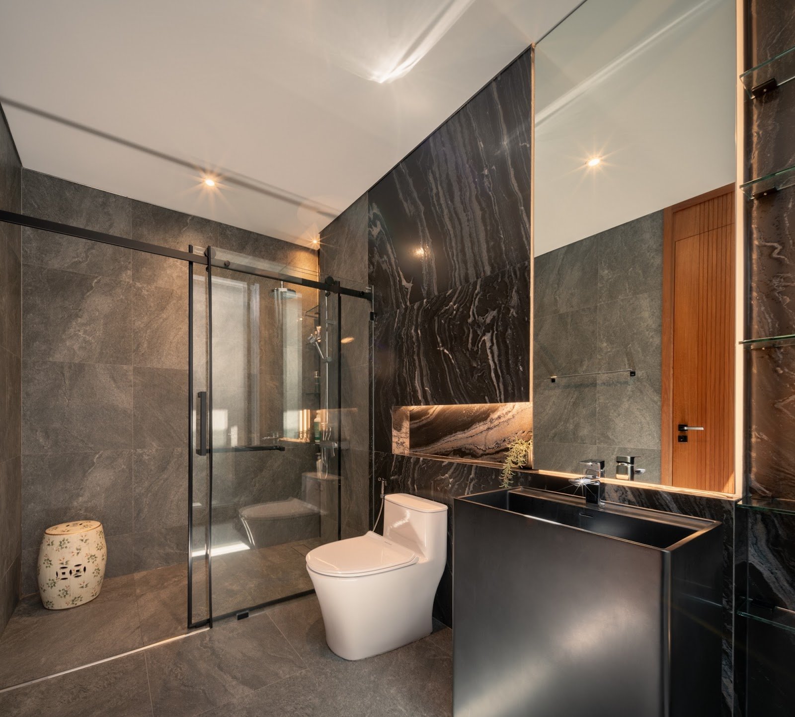 Phòng tắm sang trọng với sự kết hợp của đá xám và đá vân đen, nhấn mạnh sự tinh tế trong từng chi tiết vật liệu và ánh sáng hắt mềm mại