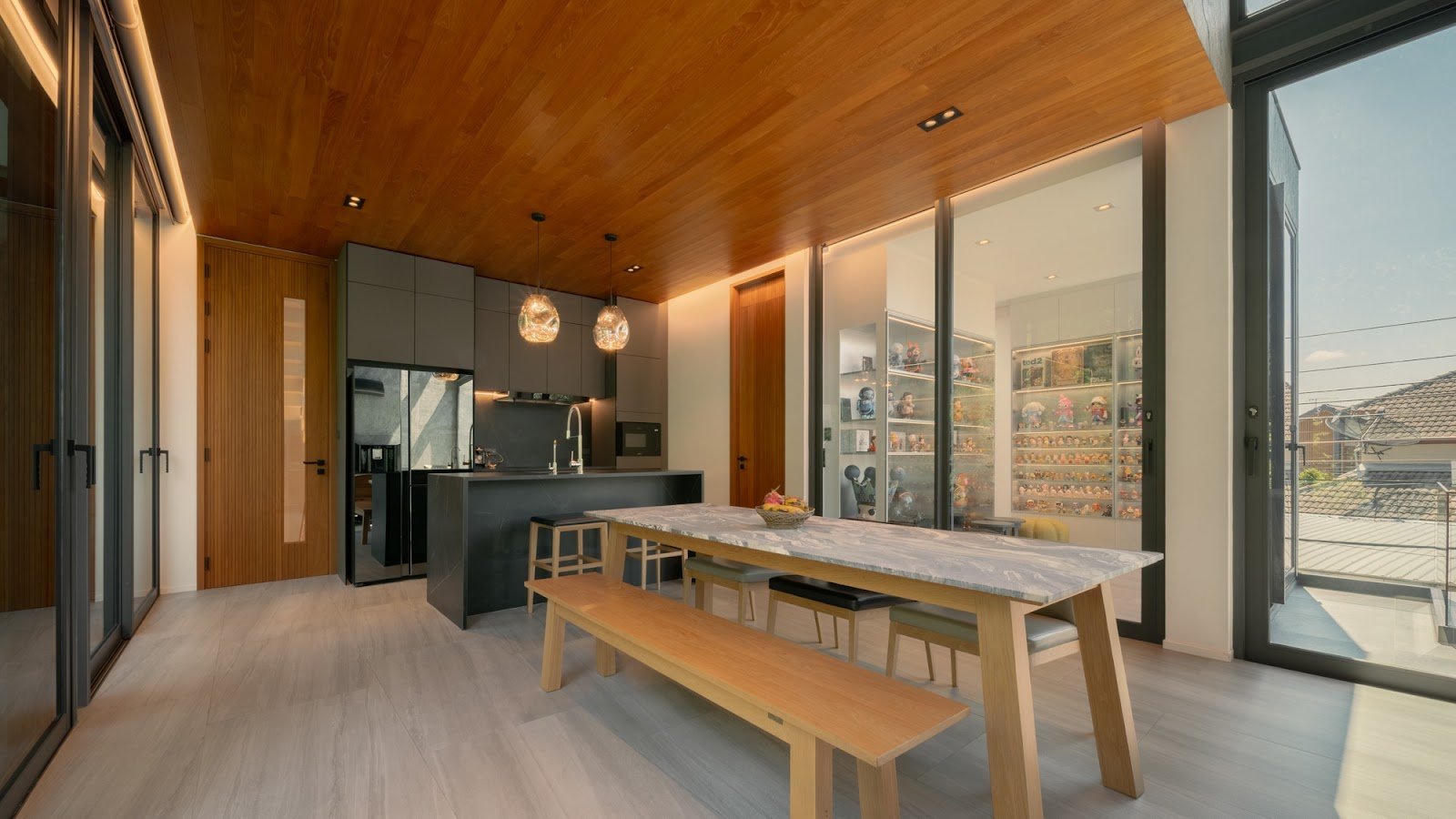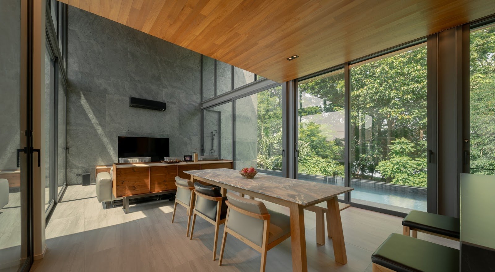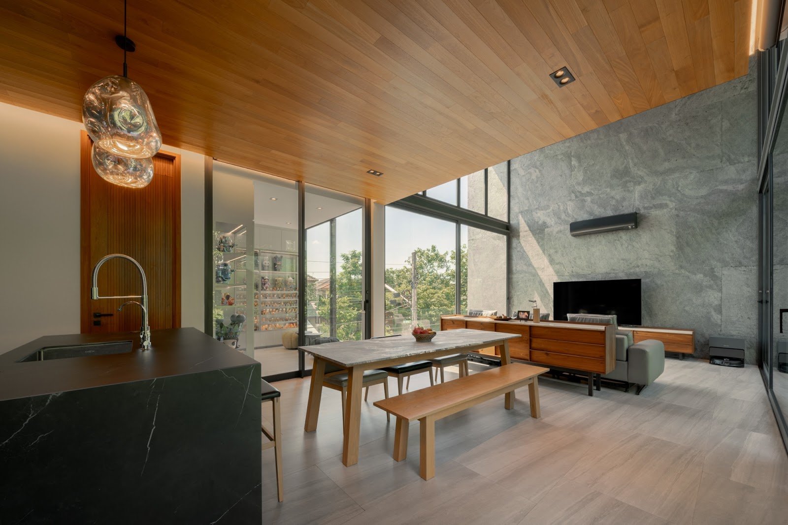 Khu vực bàn ăn thiết kế trần ốp gỗ ấm áp, tương phản với tường ốp đá xám mạnh mẽ và những khung kính lớn, tạo nên sự cân bằng tinh tế giữa vật liệu lạnh và nóng