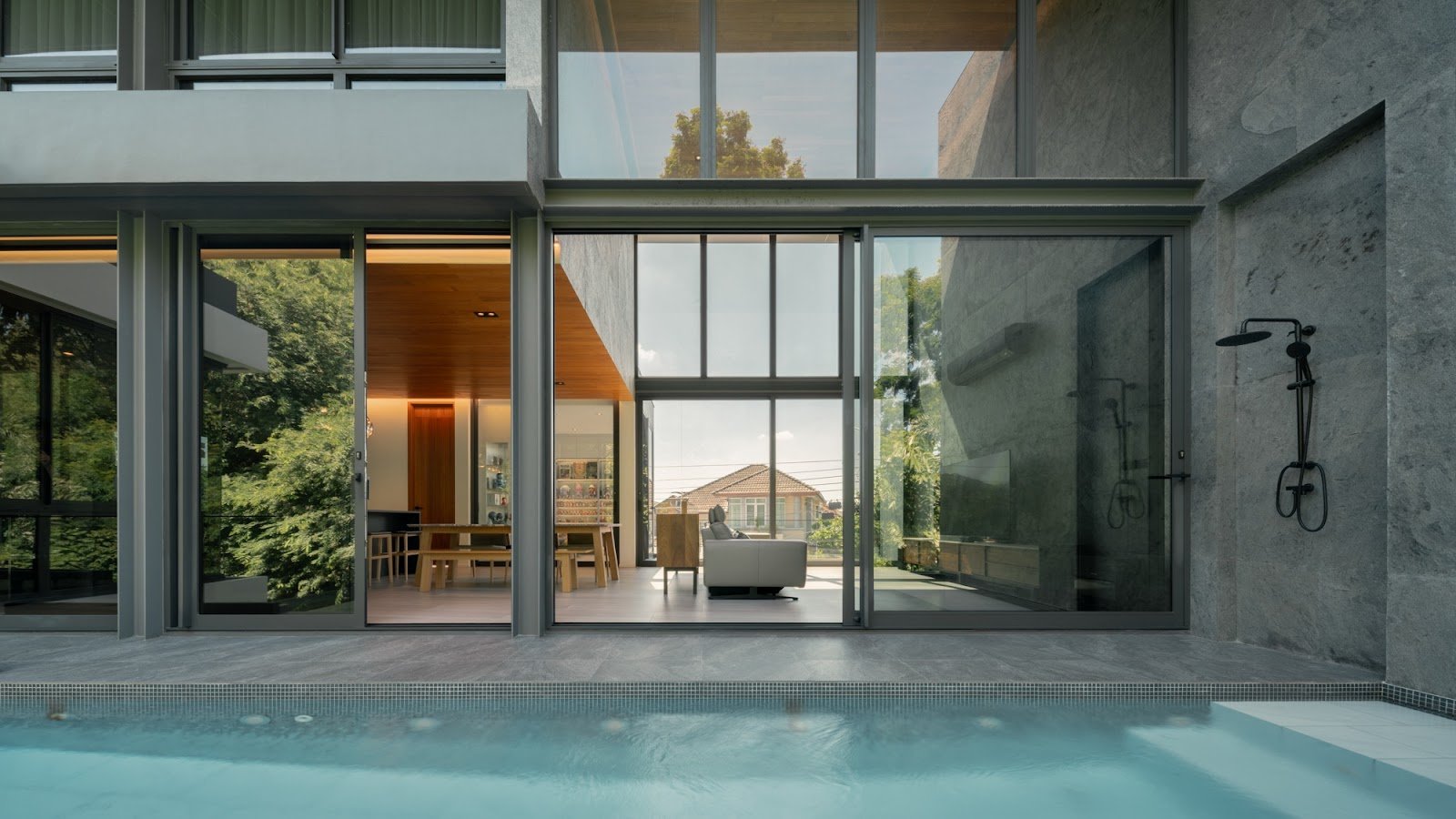 Nhà 3 tầng Baan Vela tổ chức theo tư duy mở, trong đó ranh giới giữa các không gian được xóa nhòa bằng sự chuyển tiếp khéo léo của cao độ, vật liệu và ánh sáng. Thay vì sử dụng những bức tường kiên cố, kiến trúc sư đã lựa chọn sự liên kết mềm mại để phòng khách, phòng ăn, bếp và hồ bơi kết nối thành một mặt bằng liên tục.