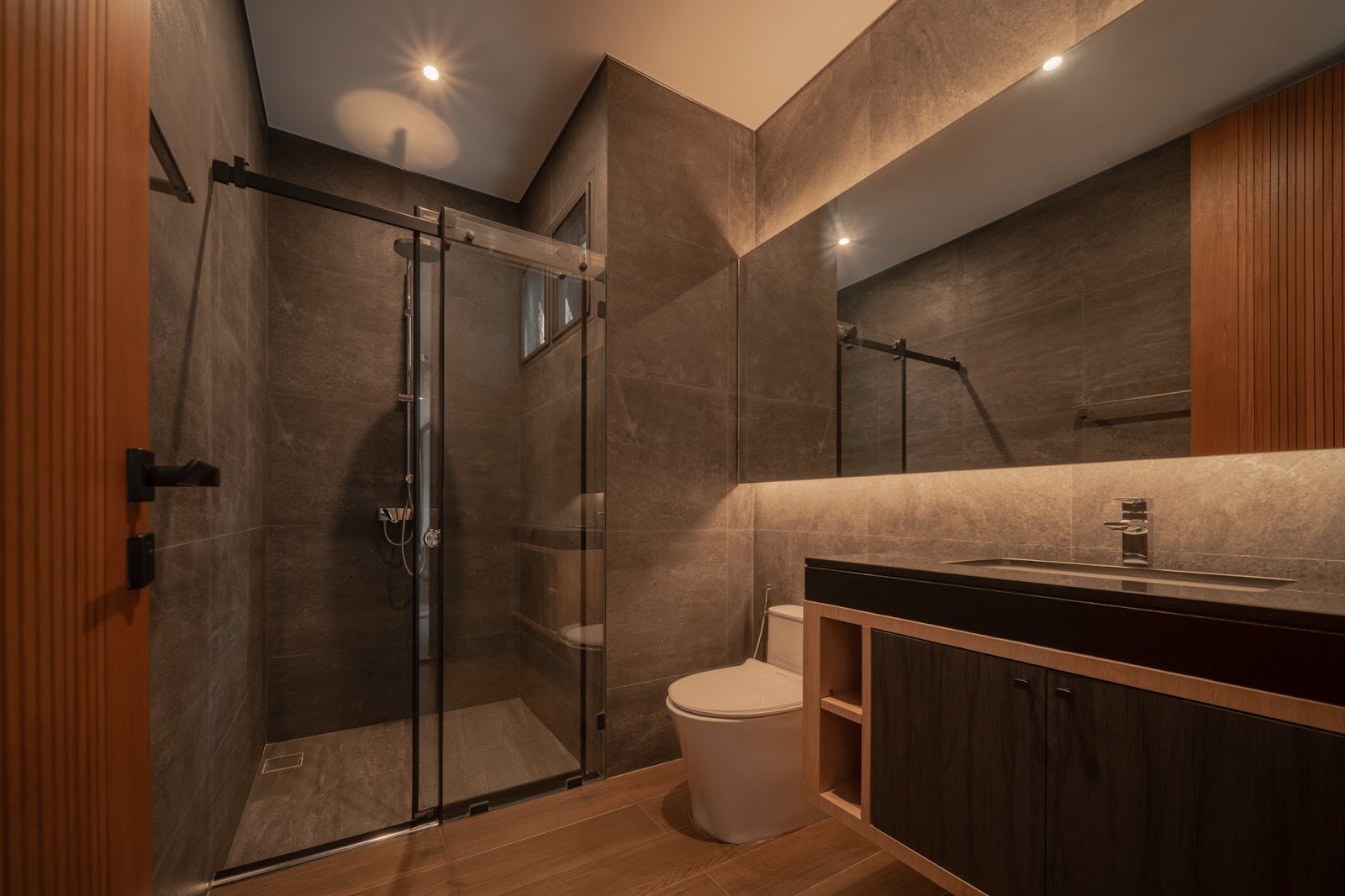Thiết kế phòng tắm đơn giản nhưng tiện nghi đầy đủ, sử dụng tông xám đồng nhất, đem lại cảm giác thanh lịch và yên tĩnh