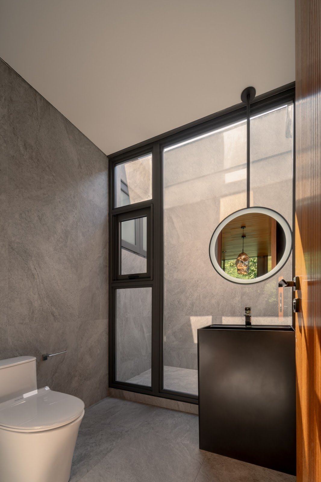 Phòng vệ sinh phụ với thiết kế tối giản, sử dụng đá xám chủ đạo, gương tròn và cửa kính lớn giúp ánh sáng tự nhiên len lỏi, mang lại cảm giác thoáng đãng và hiện đại