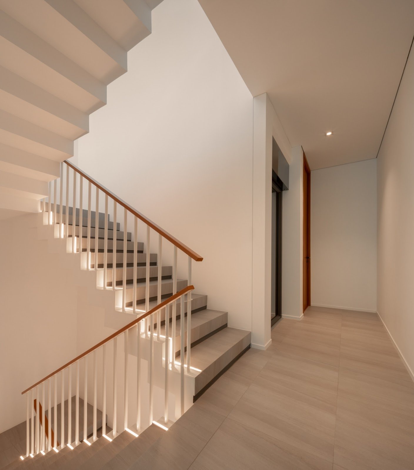 Cầu thang với tay vịn gỗ và ánh sáng hắt dưới bậc tạo hiệu ứng thị giác tinh tế, biến lối di chuyển thành trải nghiệm nhẹ nhàng