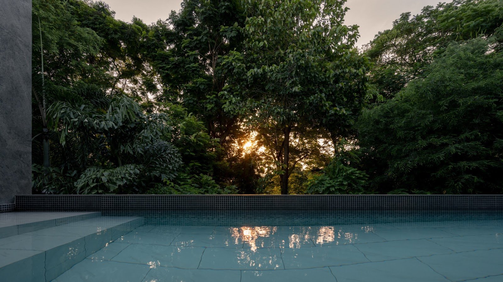 Hồ bơi được nâng lên tầng 2, mở ra tầm nhìn xanh mát, nơi ánh sáng hoàng hôn phản chiếu trên mặt nước, tạo nên khoảnh khắc yên bình hiếm có giữa phố thị