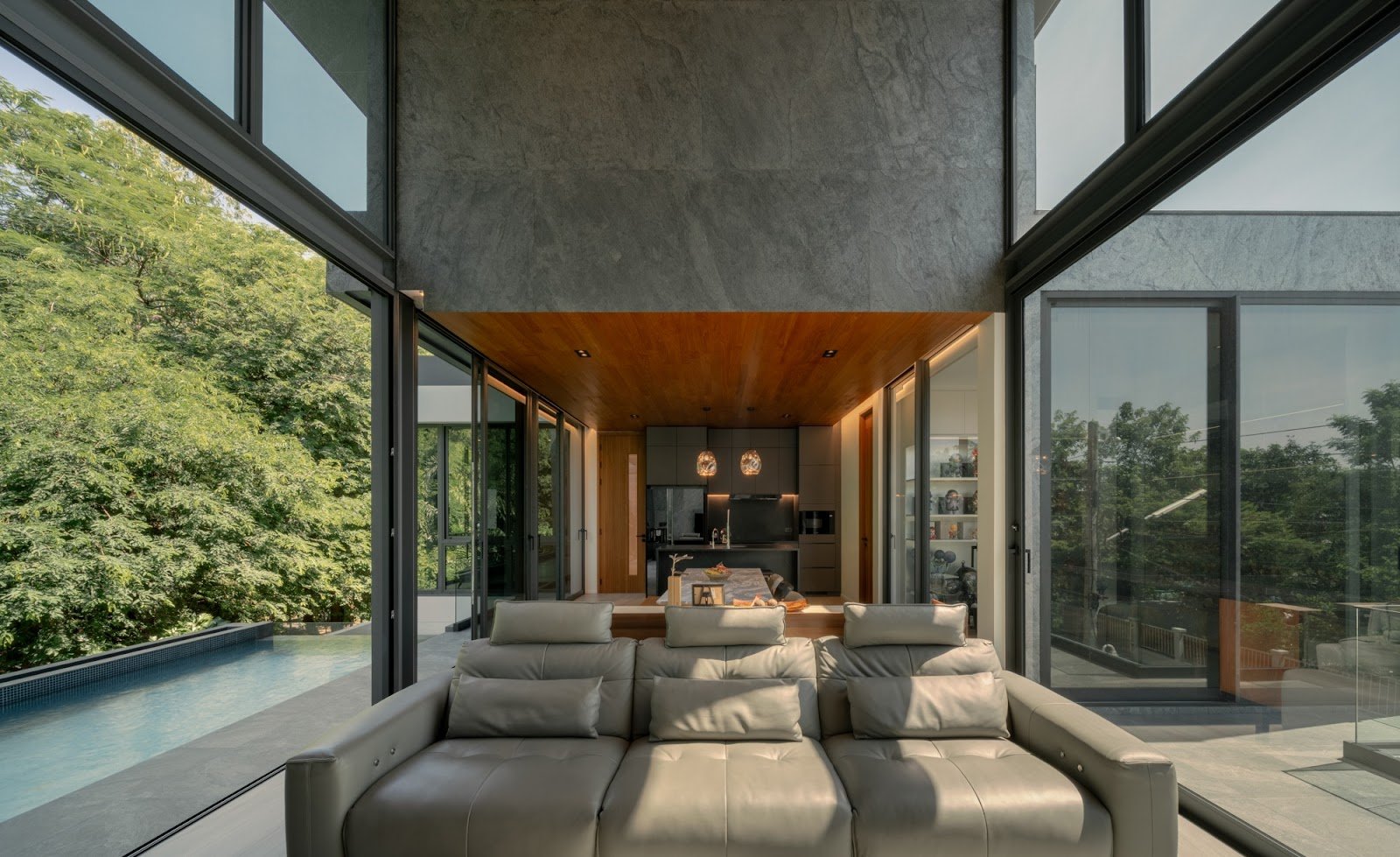 Không gian phòng khách - bếp - phòng ăn kết nối liền mạch với sofa đặt giữa hai lớp kính lớn, khẳng định triết lý mở, nơi giao thoa của ánh sáng, thiên nhiên và sinh hoạt gia đình