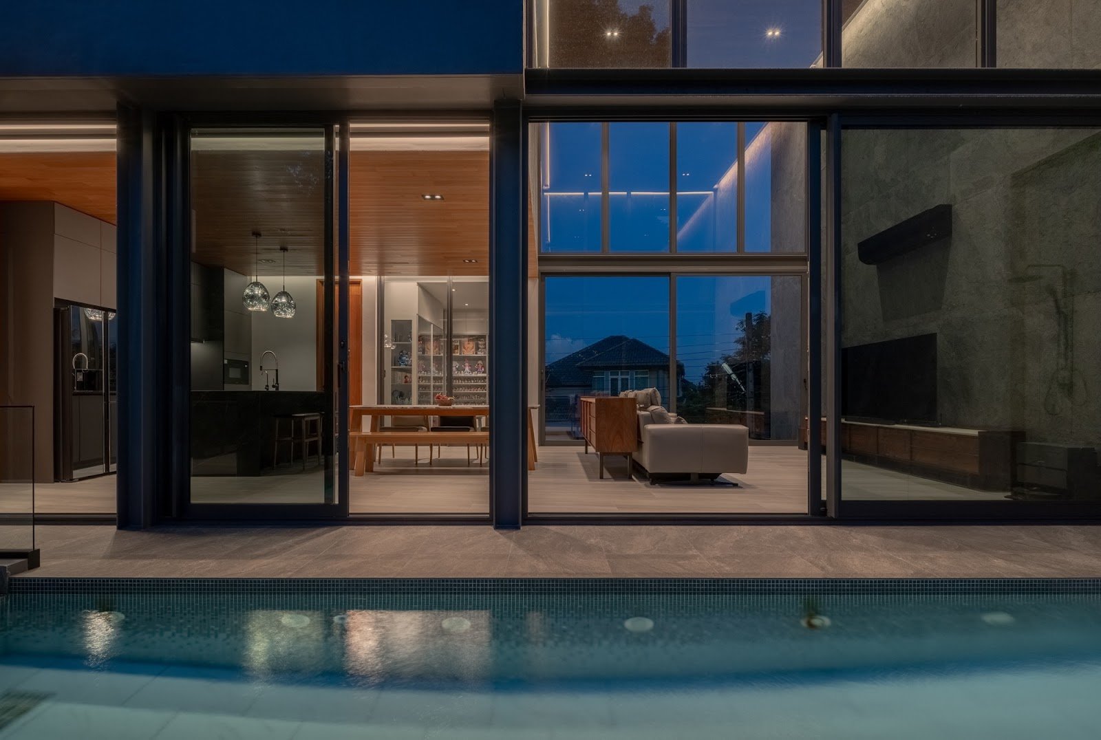 Không gian sinh hoạt chung nhìn từ hồ bơi vào, nơi ánh sáng dịu buổi tối hòa quyện với sự ấm áp từ vật liệu gỗ và đá, khẳng định tư duy thiết kế mở