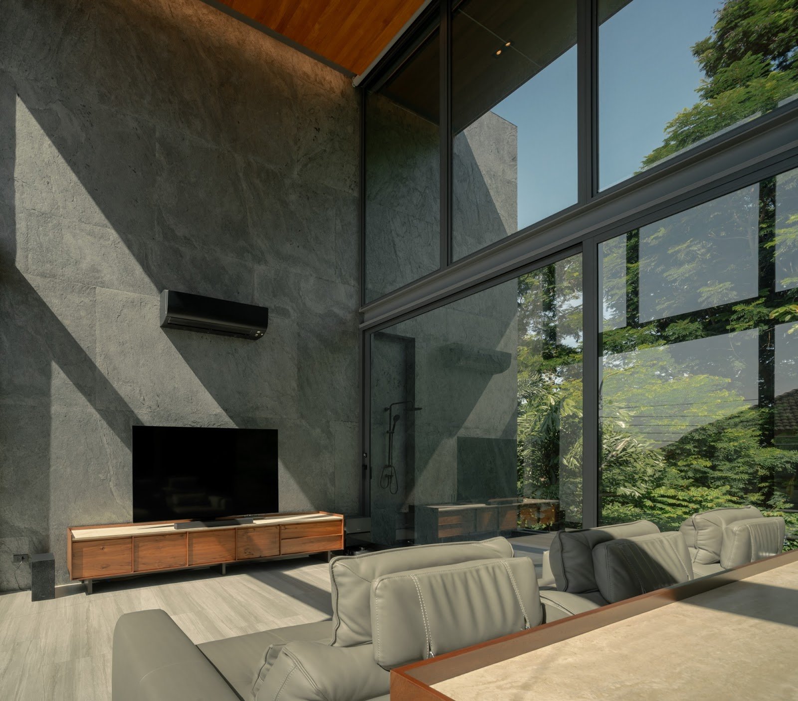 Phòng khách trần cao gấp đôi, ốp đá xám toàn bộ mảng tường chính, cửa kính lớn tạo tầm nhìn thoáng rộng, biến nơi đây thành không gian trung tâm của ngôi nhà
