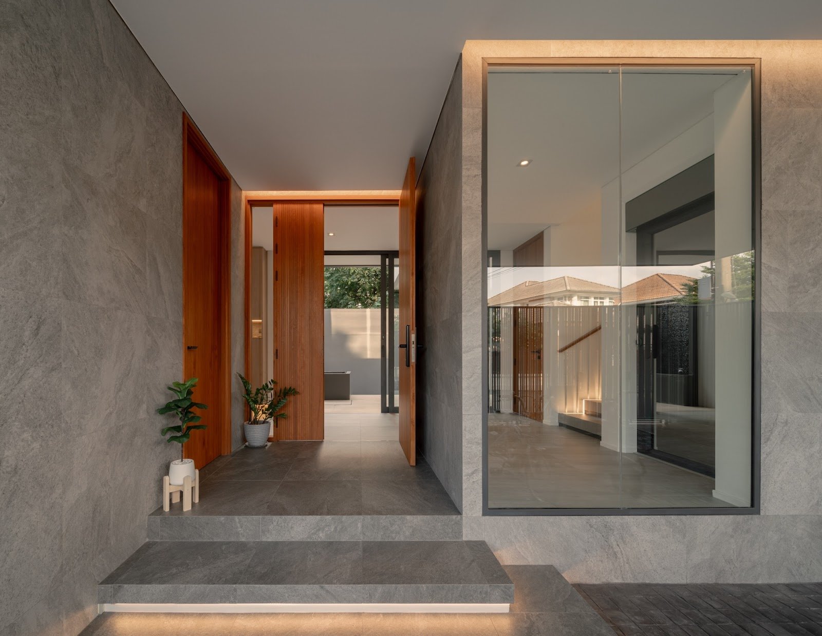 Lối vào chính ốp đá xám kết hợp cửa gỗ ấm áp, thiết kế tinh gọn nhưng vững chãi, dẫn dắt cảm xúc ngay từ khoảnh khắc bước vào nhà