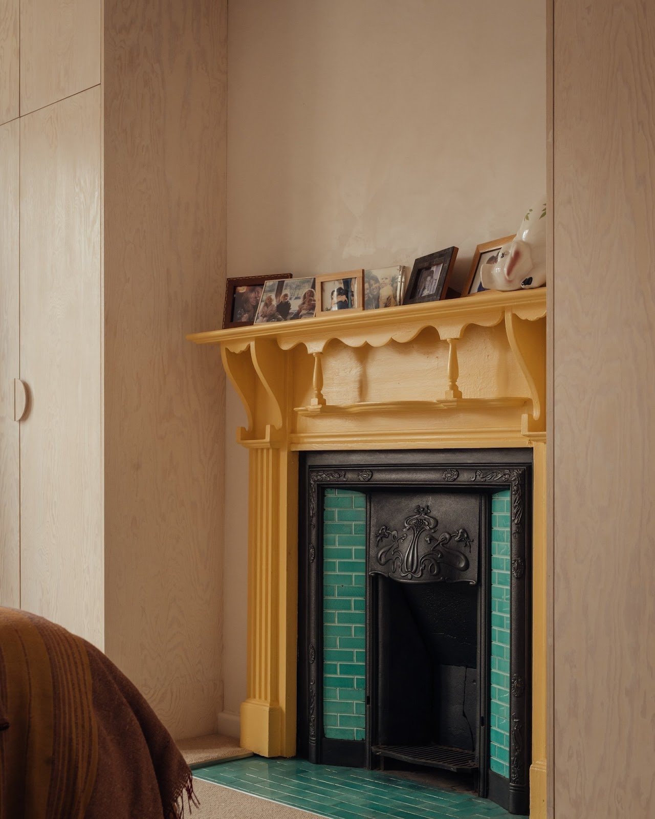 Lò sưởi cũ được làm mới bằng gam vàng - xanh, kết hợp cùng gỗ mộc, trở thành điểm nhấn hoài niệm và cá tính