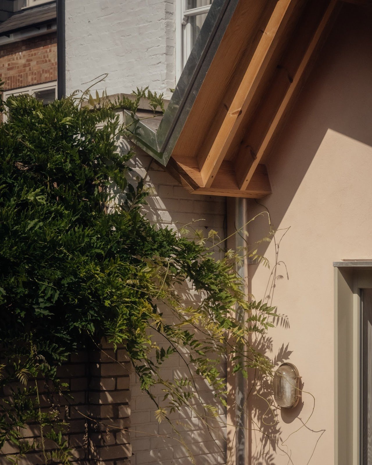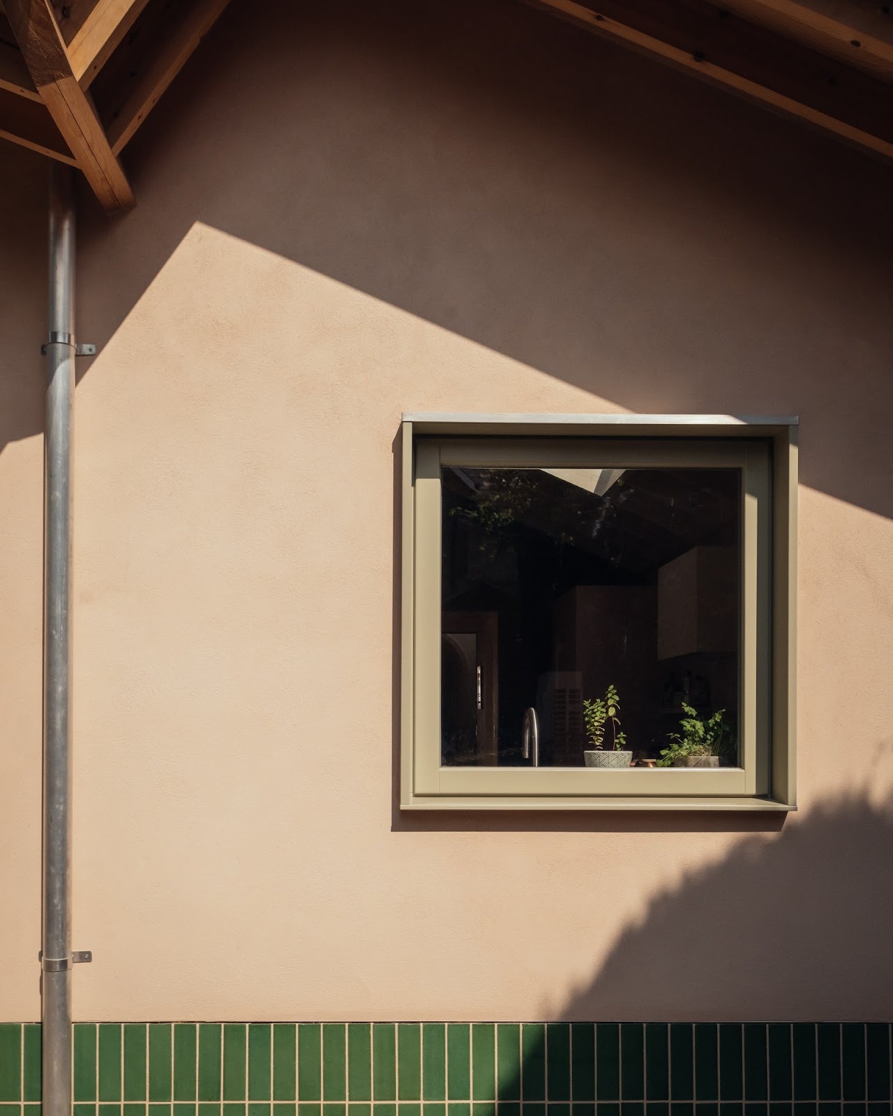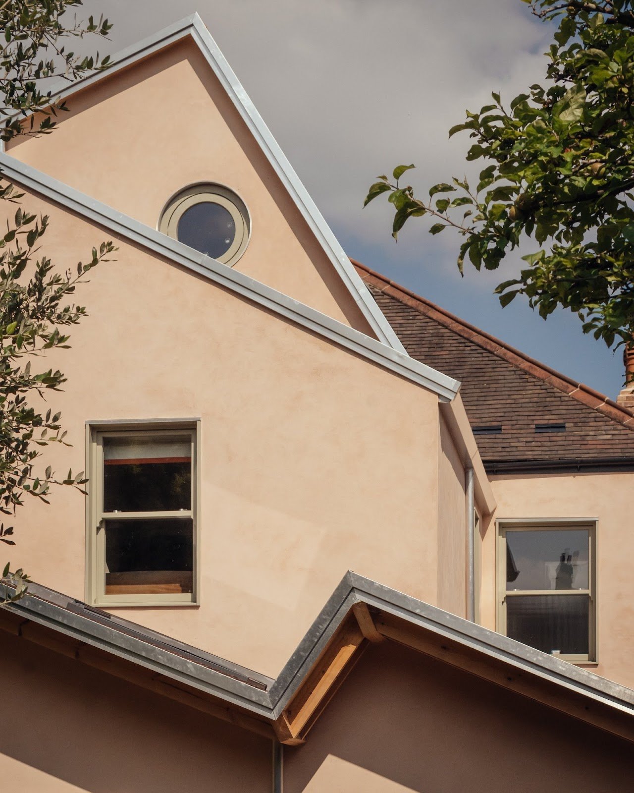 Bên cạnh đó, trong Twin Pitches, cửa sổ tròn hướng Tây đặt trên đầu hồi như điểm nhấn thị giác. Lúc này, khung cảnh hướng ra khu vườn trở thành phần nối dài tự nhiên của nội thất. Việc sử dụng khung gỗ thay cho thép cũng như giải pháp cọc vít thay móng bê tông cho phần mở rộng, cho thấy lựa chọn cấu trúc có chủ ý nhằm giảm thiểu carbon, khẳng định tinh thần “low-impact design” xuyên suốt công trình.