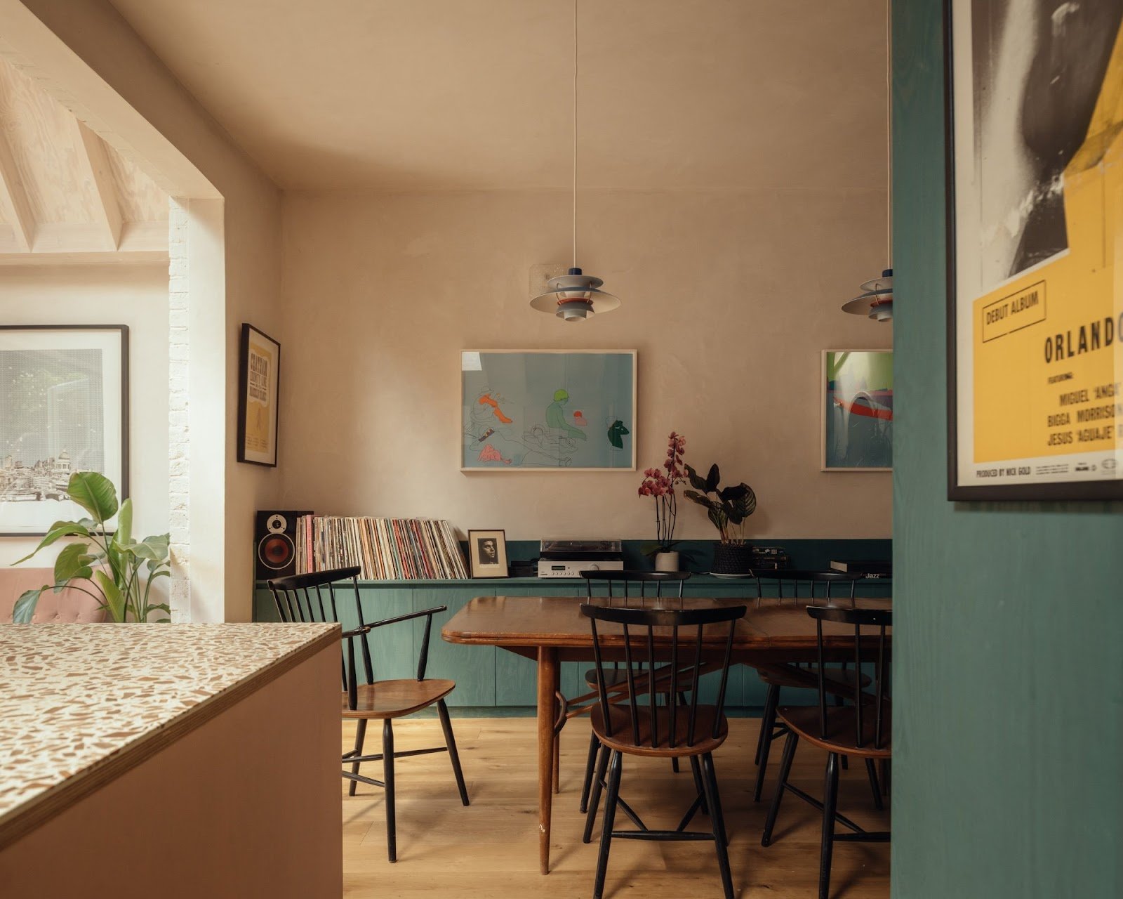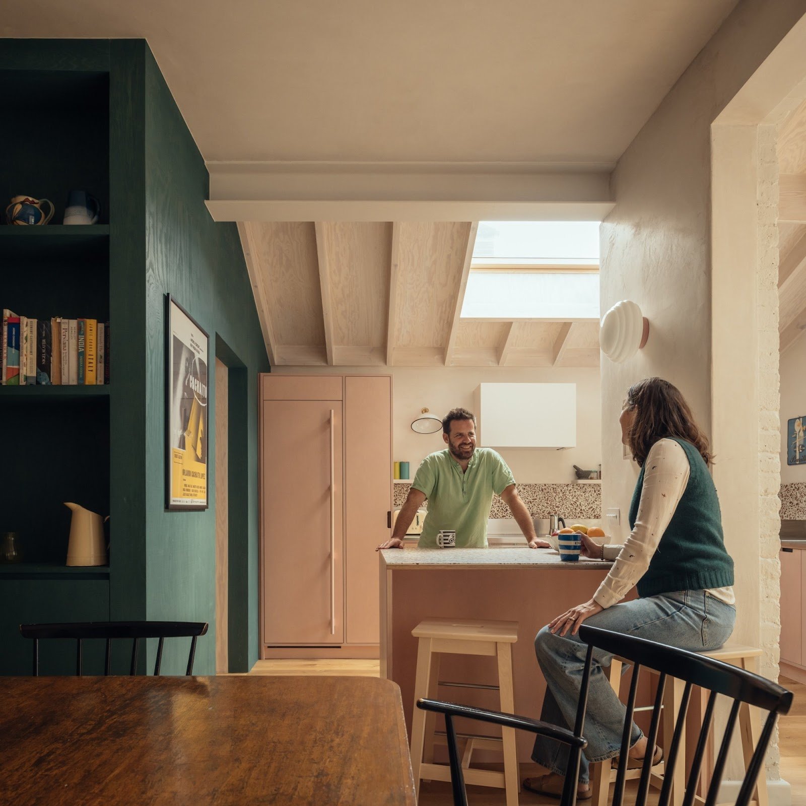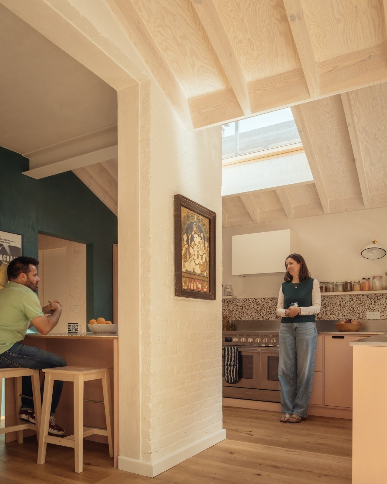 Bếp với tủ gỗ dán, mặt bàn terrazzo tái chế cùng không gian ngập tràn ánh sáng, đây là sự kết hợp giữa thẩm mỹ và bền vững đúng với tinh thần thiết kế Twin Pitches