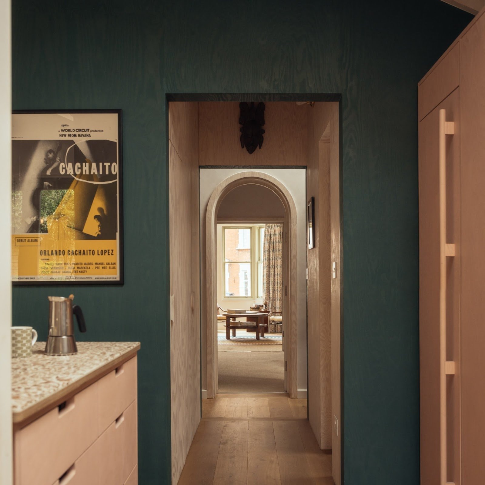 Không gian sinh hoạt chung với tường xanh và tủ bếp hồng pastel, tạo bảng màu độc đáo, ấm áp