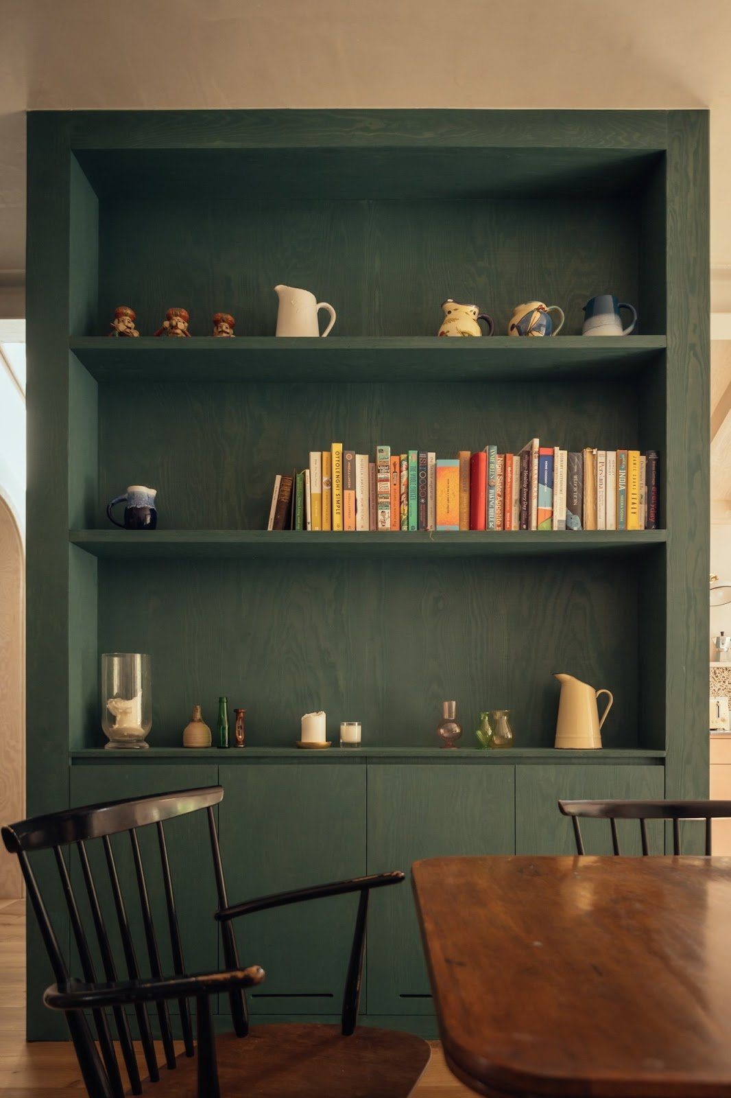 Tủ âm tường màu xanh trong phòng ăn, nơi trưng bày sách và đồ gốm - biểu tượng cho cá tính gia chủ