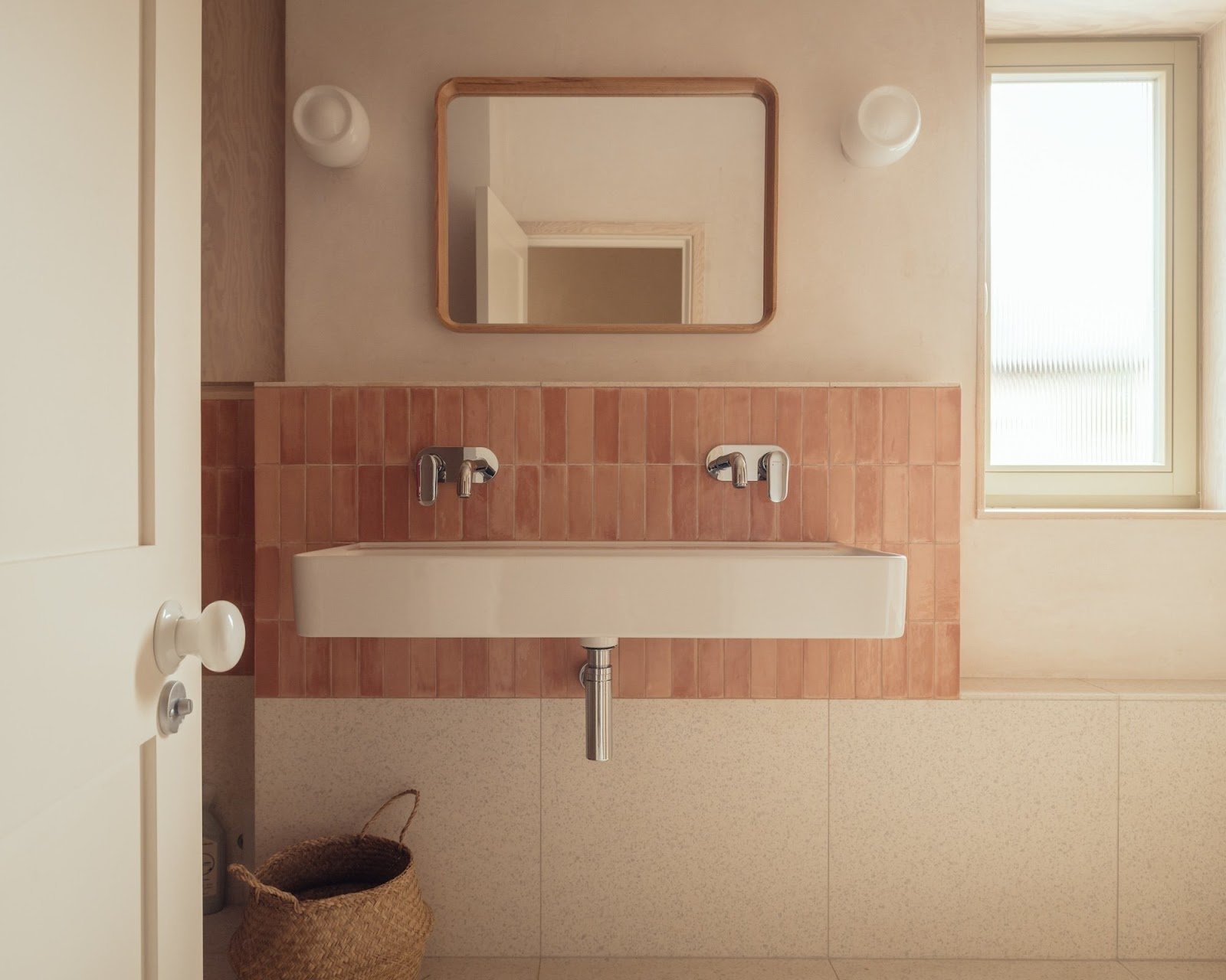 Phòng tắm nhỏ gọn với gạch ốp màu đất nung và bồn rửa đôi, tôn vinh cảm giác tự nhiên, ấm áp