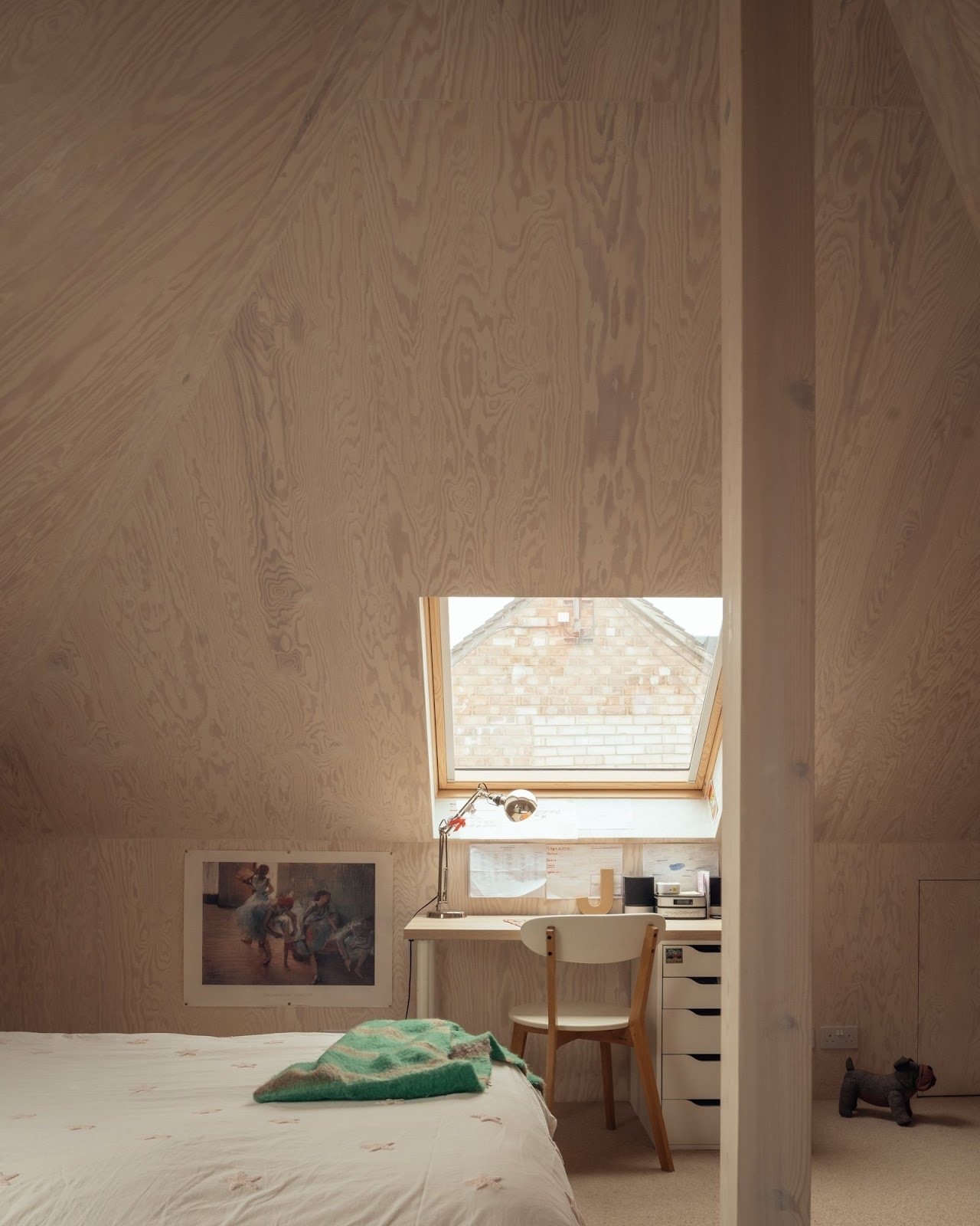 Phòng ngủ trên gác mái với trần lộ gỗ dán và cửa sổ mái, tạo không gian sáng sủa và gắn kết với bầu trời