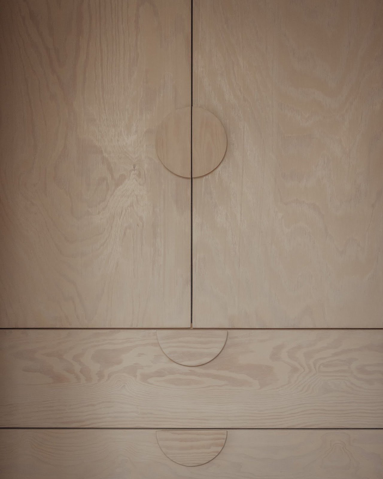 Chi tiết tủ gỗ dán với tay nắm âm tròn, thể hiện tinh thần thủ công mộc mạc và tính bền vững trong thiết kế