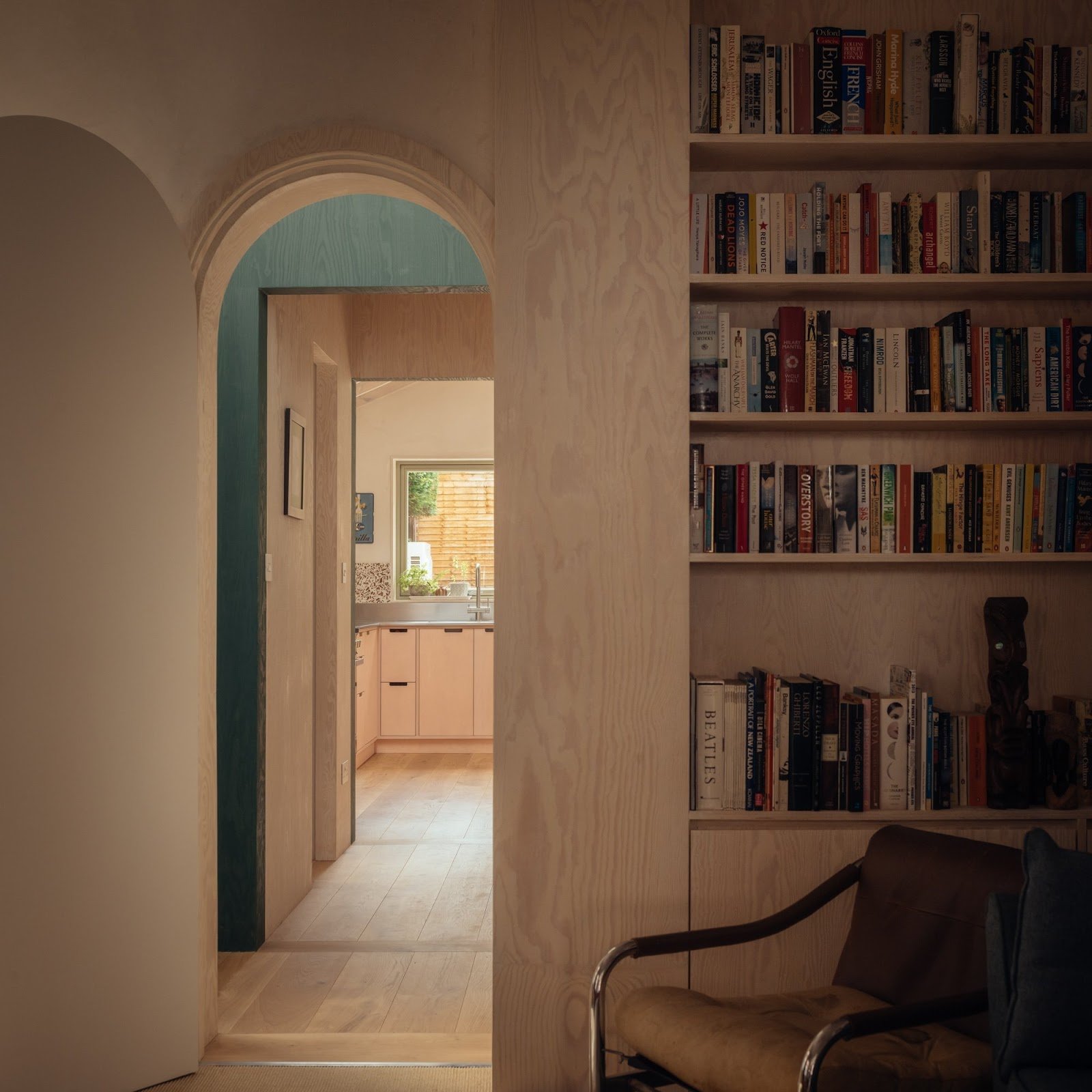 Thư viện nhỏ kết hợp vòm gỗ và ánh sáng tự nhiên, tạo không gian yên tĩnh để đọc và suy ngẫm
