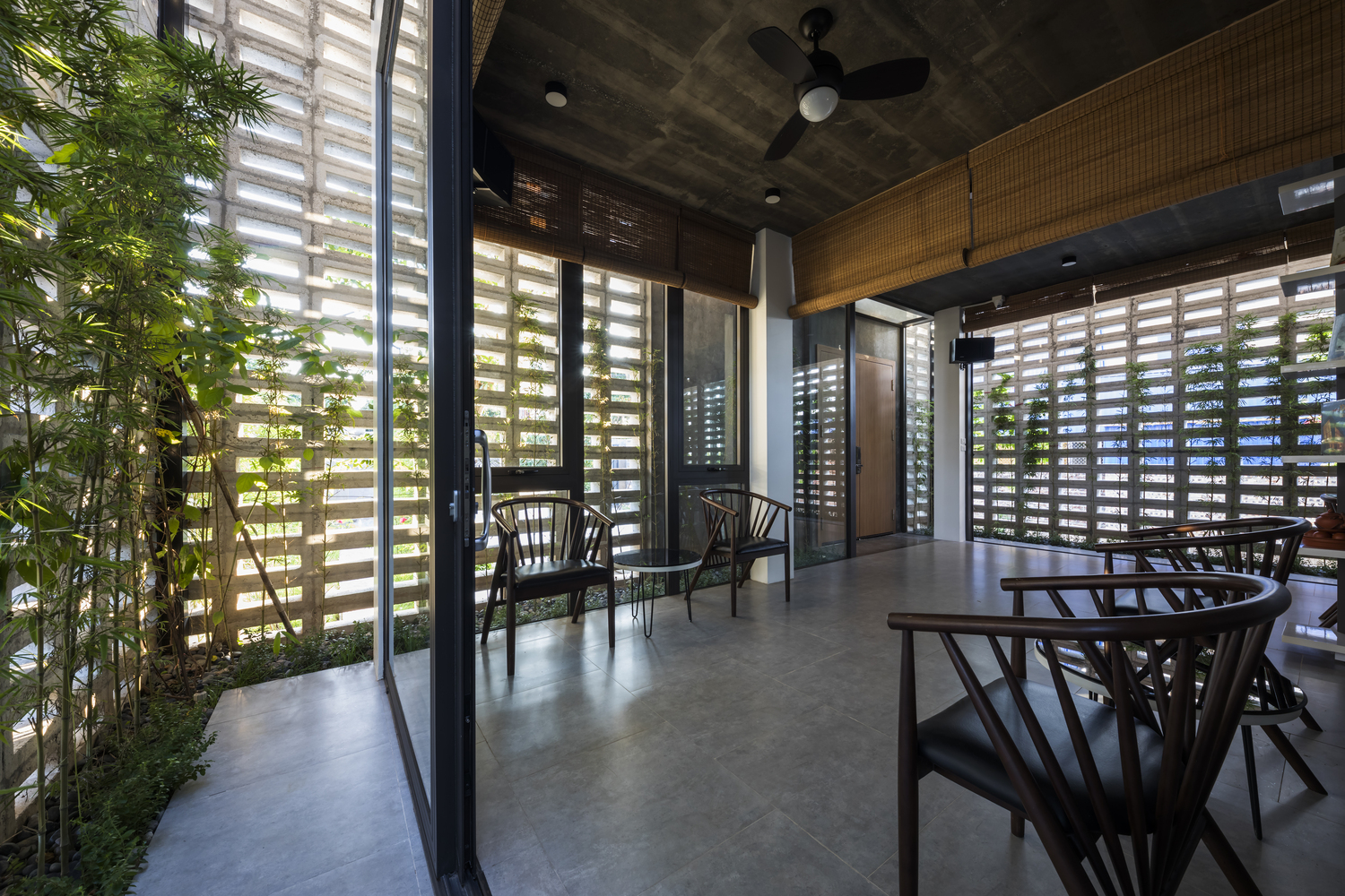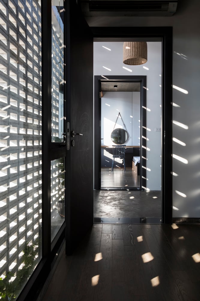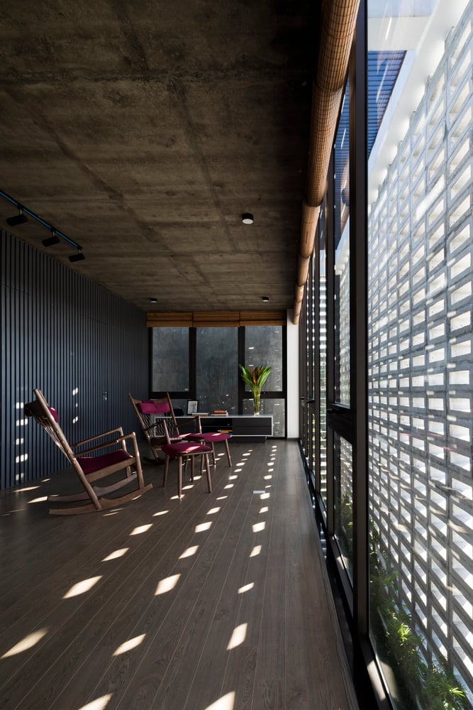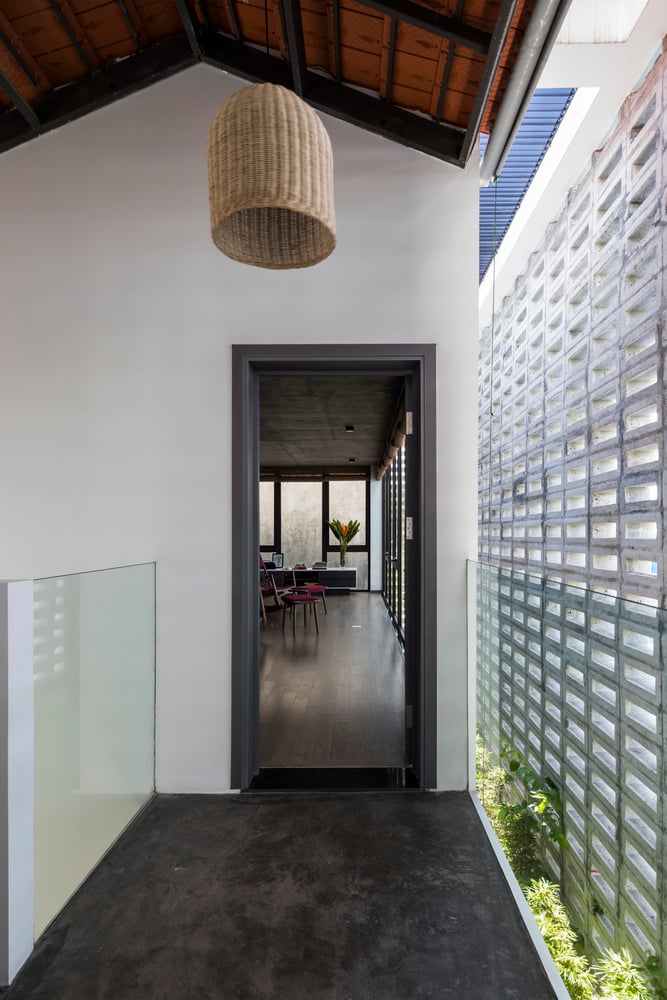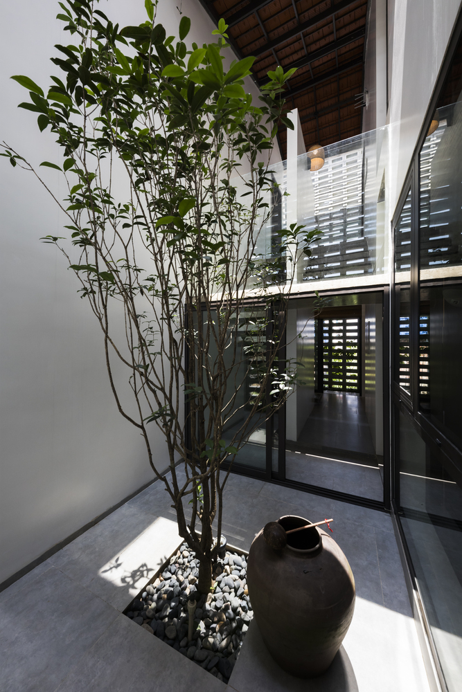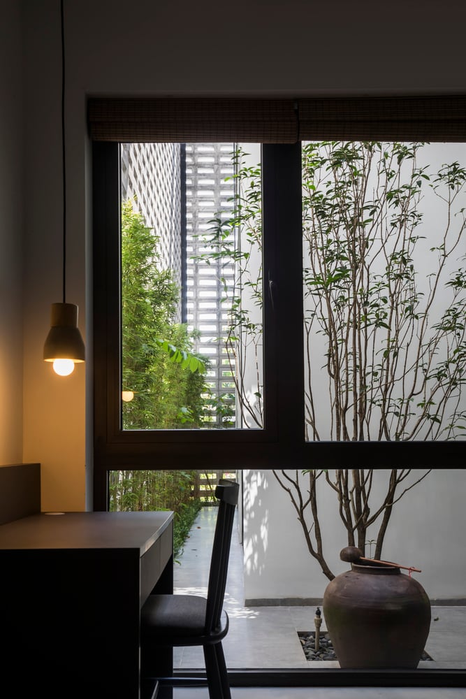 Mỗi không gian đều có tường khoang hoặc hệ cửa kính lớn hướng ra sân hoặc hành lang, nhờ đó gió trời và ánh sáng luôn hiện diện trong mọi sinh hoạt hàng ngày của gia đình.