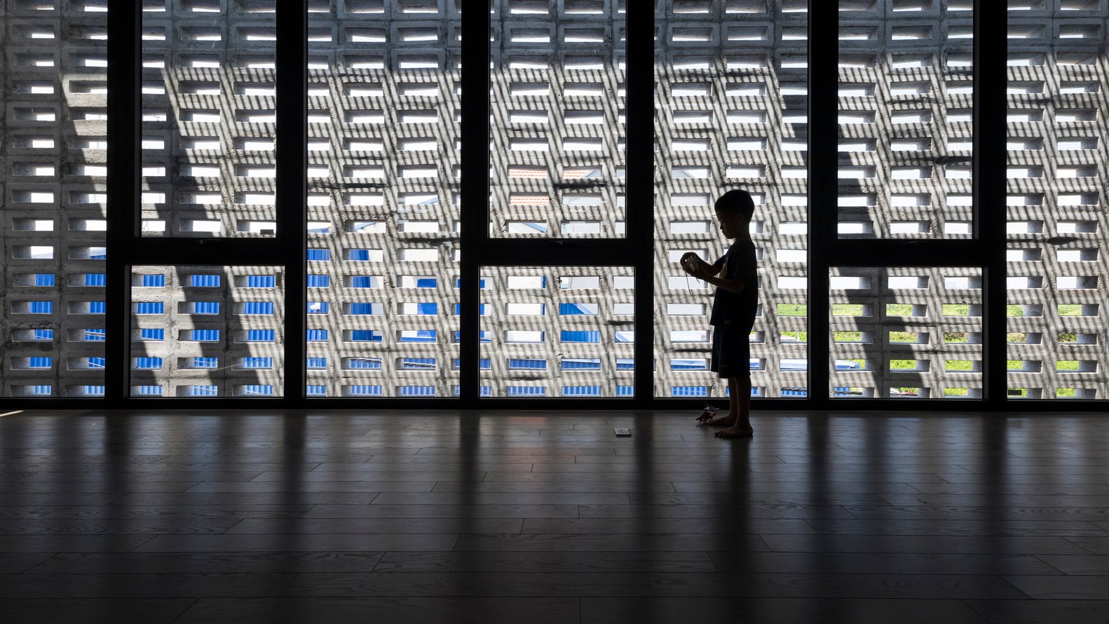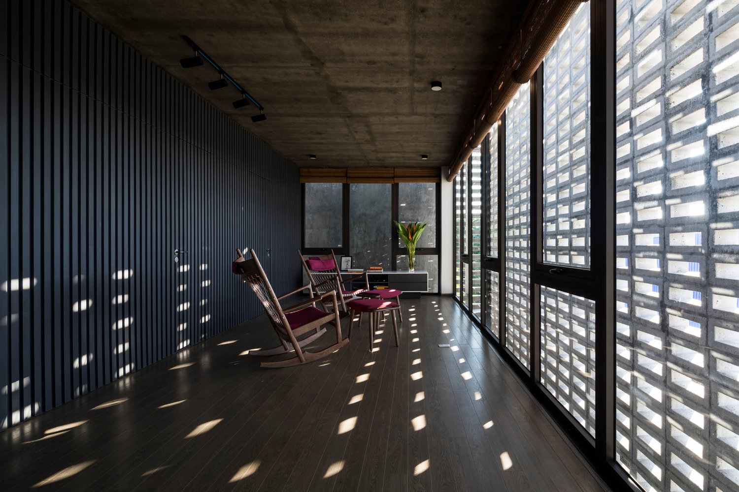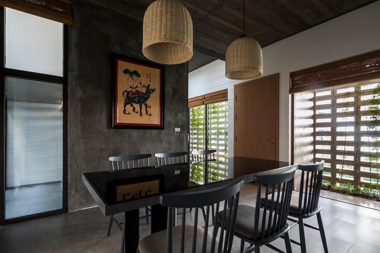 Mỗi không gian đều có tường khoang hoặc hệ cửa kính lớn hướng ra sân hoặc hành lang, nhờ đó gió trời và ánh sáng luôn hiện diện trong mọi sinh hoạt hàng ngày của gia đình.