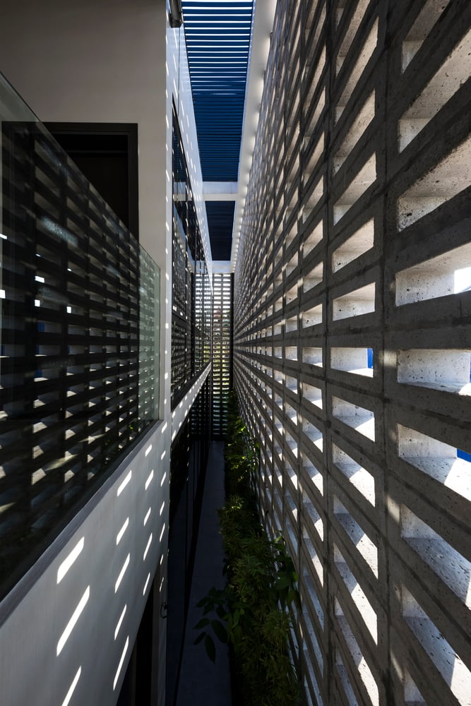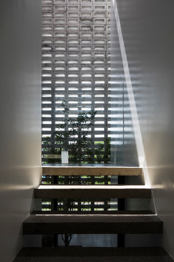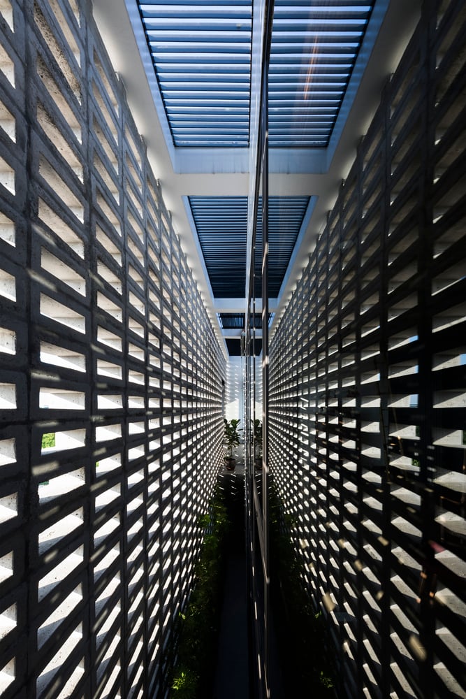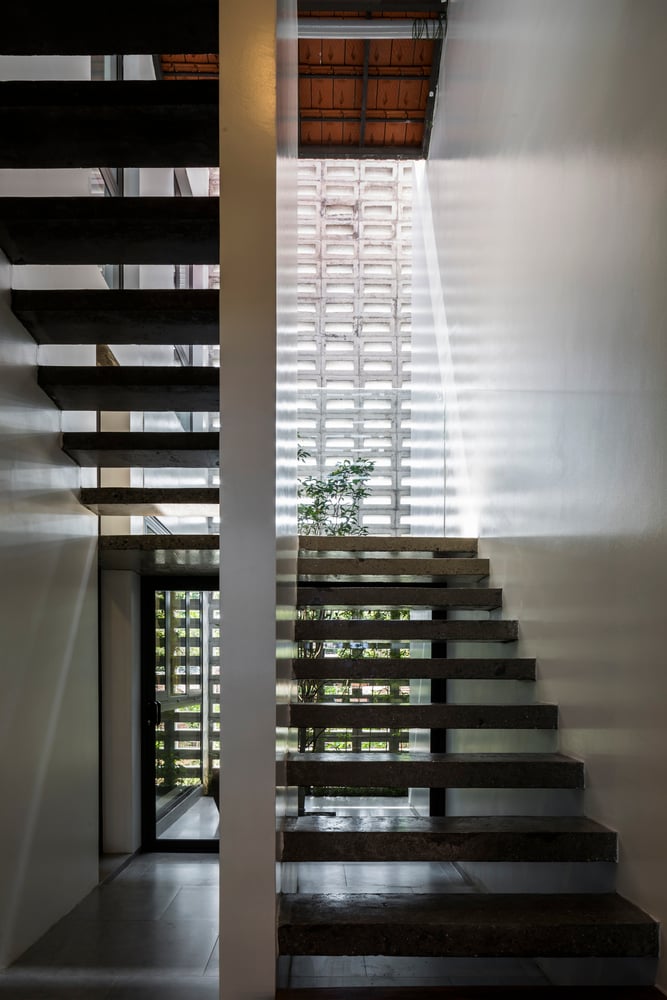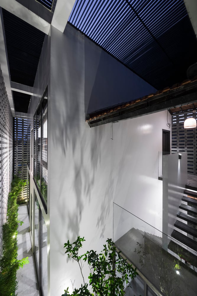 Do tọa độ công trình nằm trên trục ánh sáng từ sáng sớm đến chiều muộn, hiện tượng nóng tích tụ trong nhà là điều khó tránh khỏi – dù khu vực không chịu ảnh hưởng của đảo nhiệt đô thị. Vì vậy, đội ngũ thiết kế đã lựa chọn giữ lại lớp tường ngoài dày để cách nhiệt, đồng thời loại bỏ một phần tường trong, tạo ra khoang đệm khí giúp nhà chống nóng hiệu quả hơn trong những ngày hè oi bức.