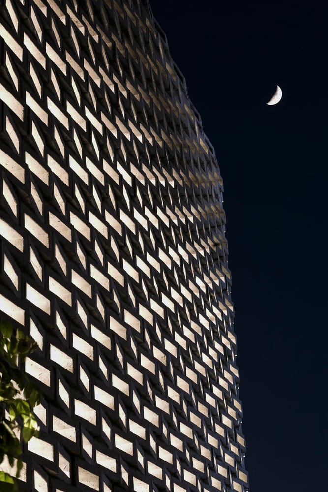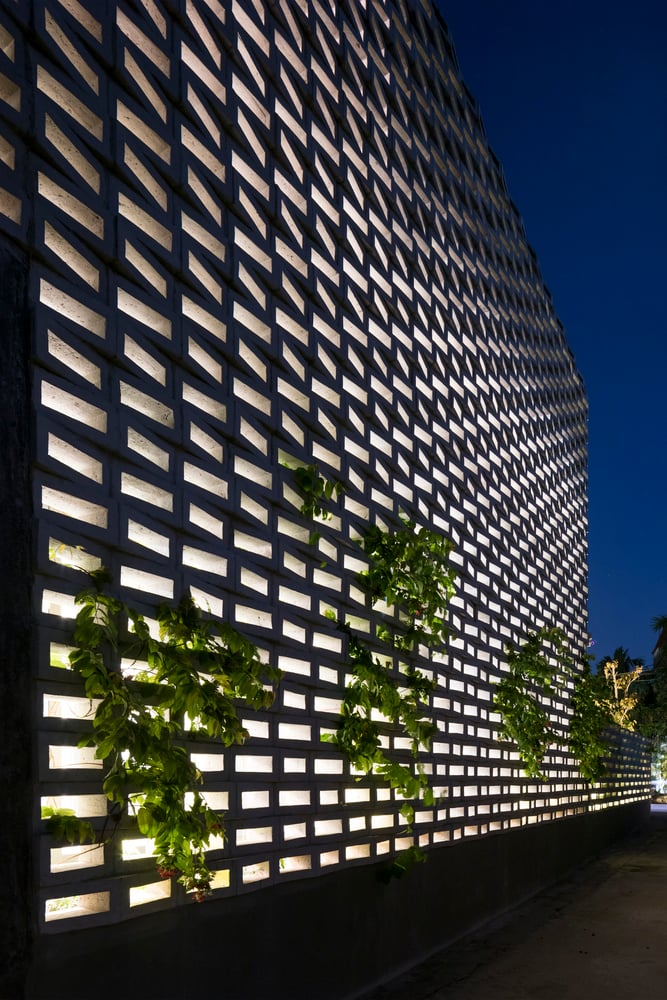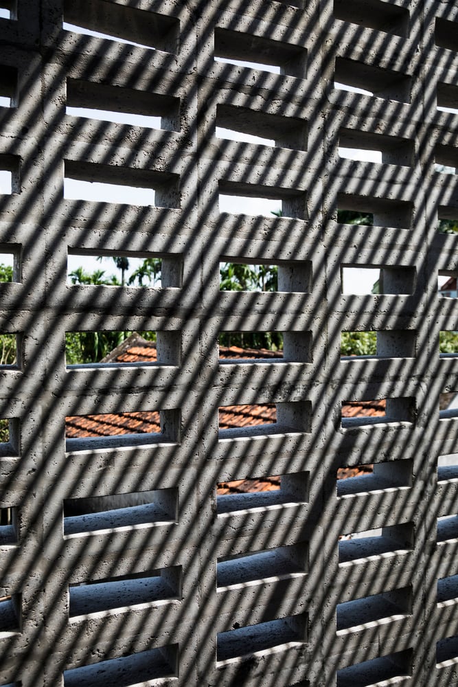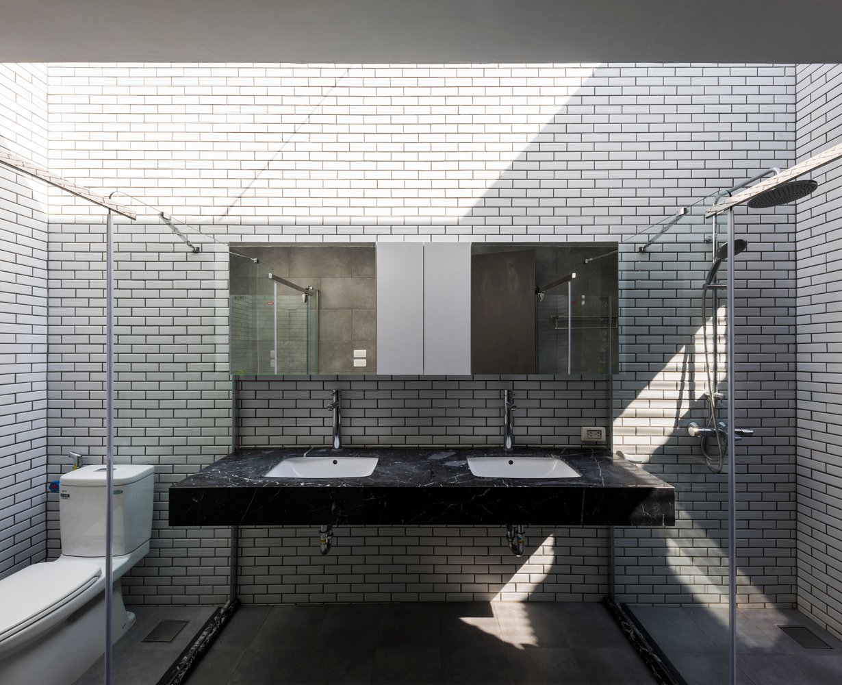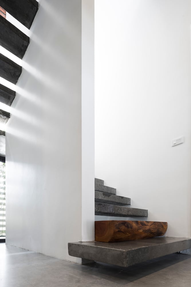 Do tọa độ công trình nằm trên trục ánh sáng từ sáng sớm đến chiều muộn, hiện tượng nóng tích tụ trong nhà là điều khó tránh khỏi – dù khu vực không chịu ảnh hưởng của đảo nhiệt đô thị. Vì vậy, đội ngũ thiết kế đã lựa chọn giữ lại lớp tường ngoài dày để cách nhiệt, đồng thời loại bỏ một phần tường trong, tạo ra khoang đệm khí giúp nhà chống nóng hiệu quả hơn trong những ngày hè oi bức.