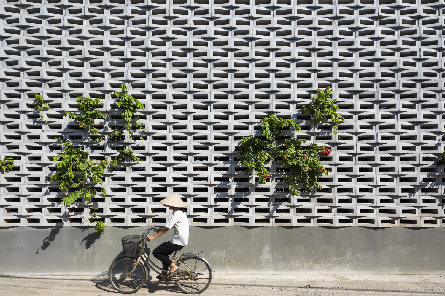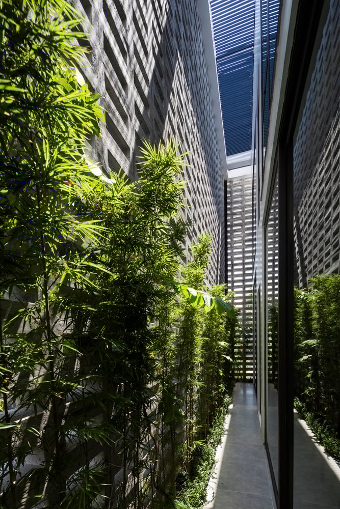 Ngoài ra, để tăng hiệu quả trao đổi khí, các mảng tường khoang phía đón gió được phủ cây dây leo như Rangoon creeper hay Tigon. Hệ tường xanh này hoạt động như một bộ lọc không khí, giảm khói bụi và mang đến không gian mát lành. Tre cao khoảng 2m được trồng dọc hành lang góp phần cản gió lạnh mùa đông và giữ độ ẩm tự nhiên cho sân vườn.