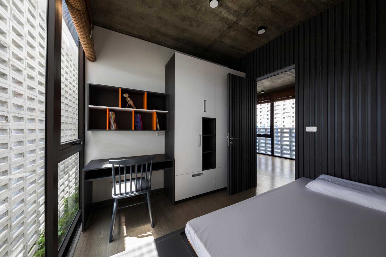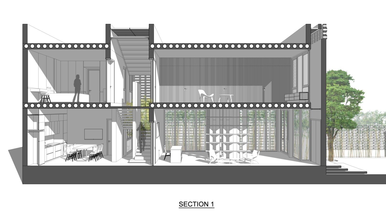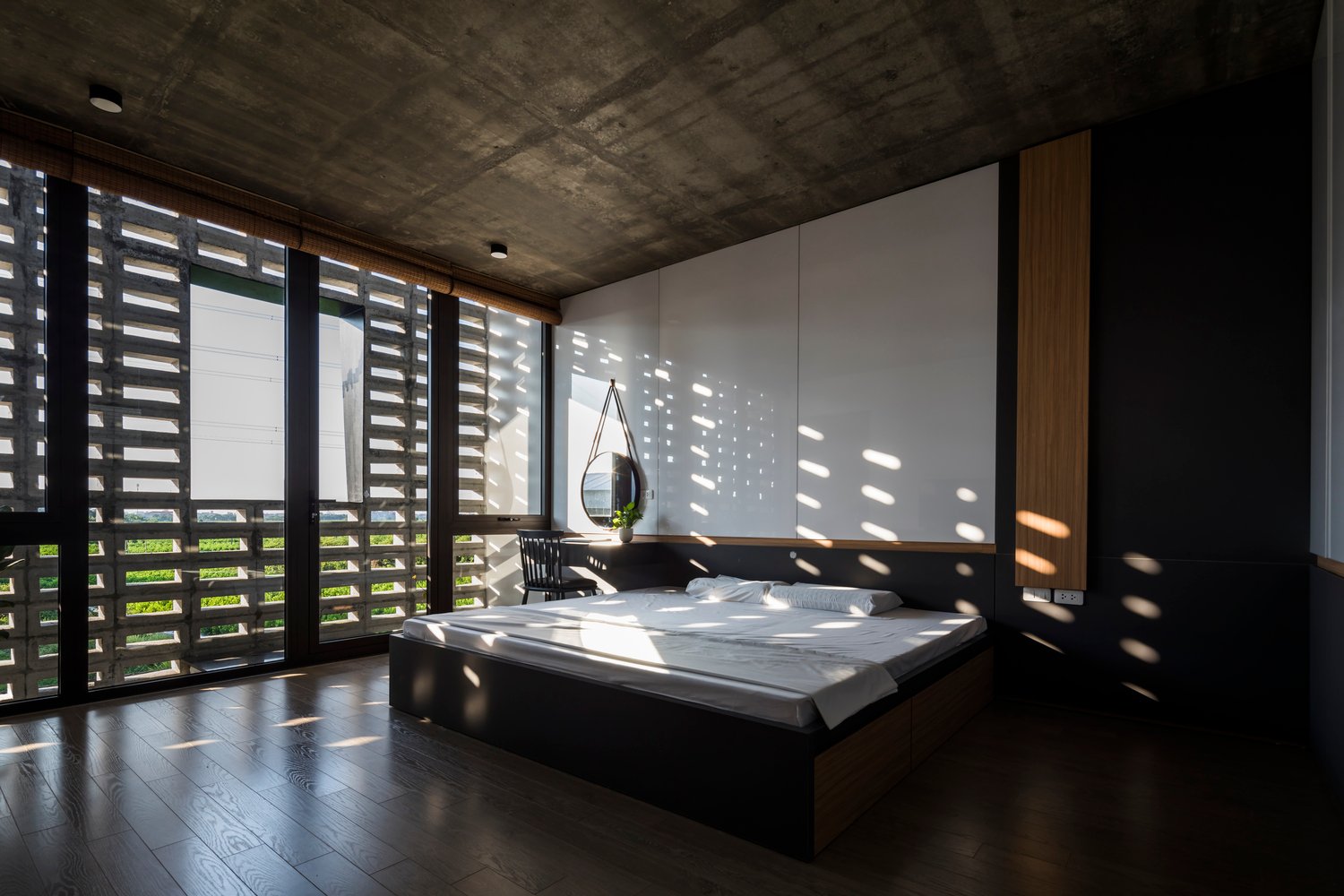 Khối nhà phía sau gồm bếp, phòng ăn, các phòng ngủ (bao gồm cả phòng khách) được thiết kế mở hoàn toàn với giải pháp đón ánh sáng tự nhiên tối ưu. Trong khi đó, khối phía trước – với các phòng dịch vụ và hai phòng ngủ cho con – vẫn đảm bảo được sự riêng tư nhưng không bị tách biệt về thị giác.