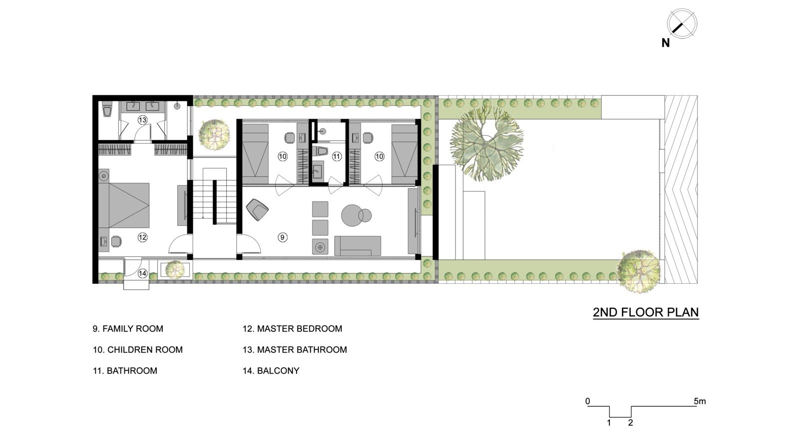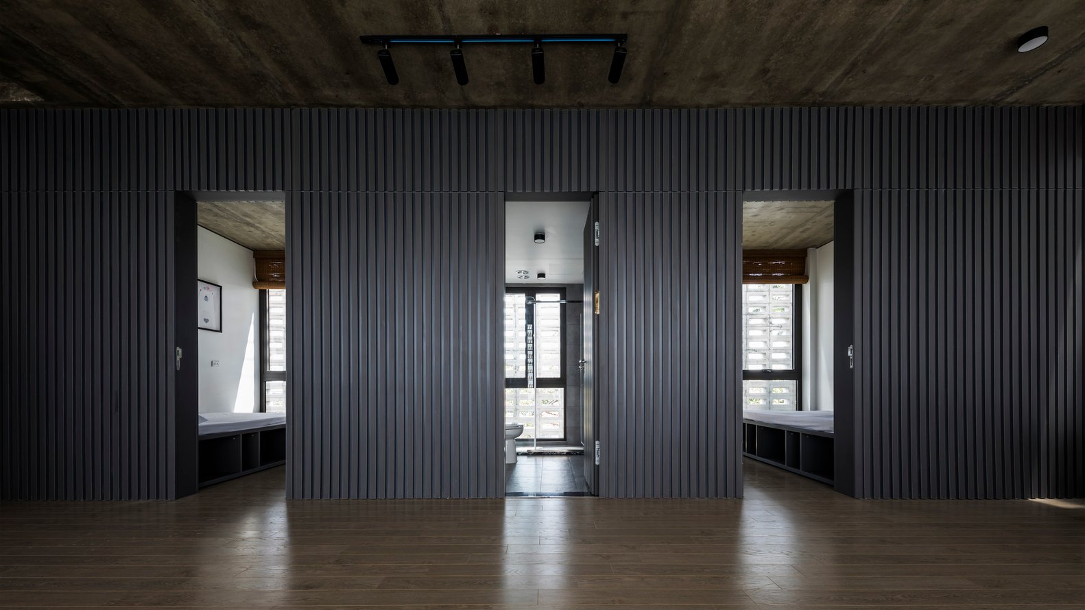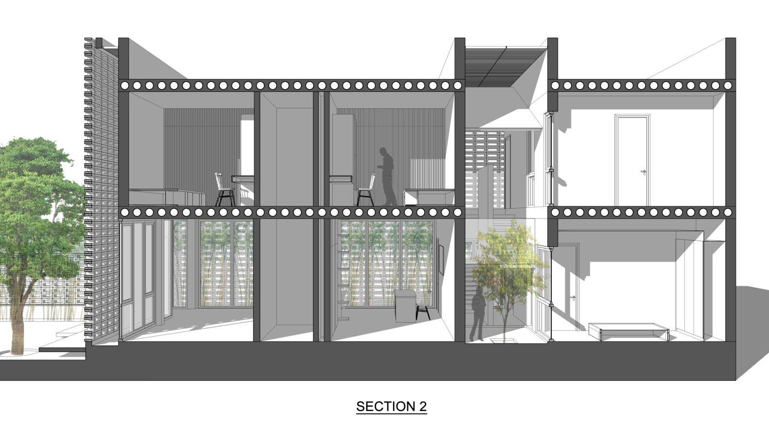Khối nhà phía sau gồm bếp, phòng ăn, các phòng ngủ (bao gồm cả phòng khách) được thiết kế mở hoàn toàn với giải pháp đón ánh sáng tự nhiên tối ưu. Trong khi đó, khối phía trước – với các phòng dịch vụ và hai phòng ngủ cho con – vẫn đảm bảo được sự riêng tư nhưng không bị tách biệt về thị giác.
