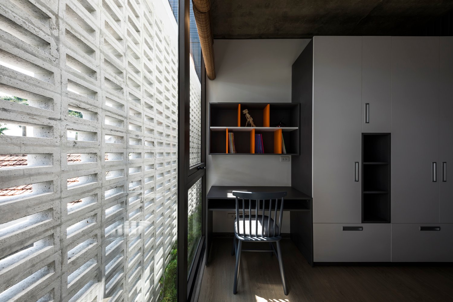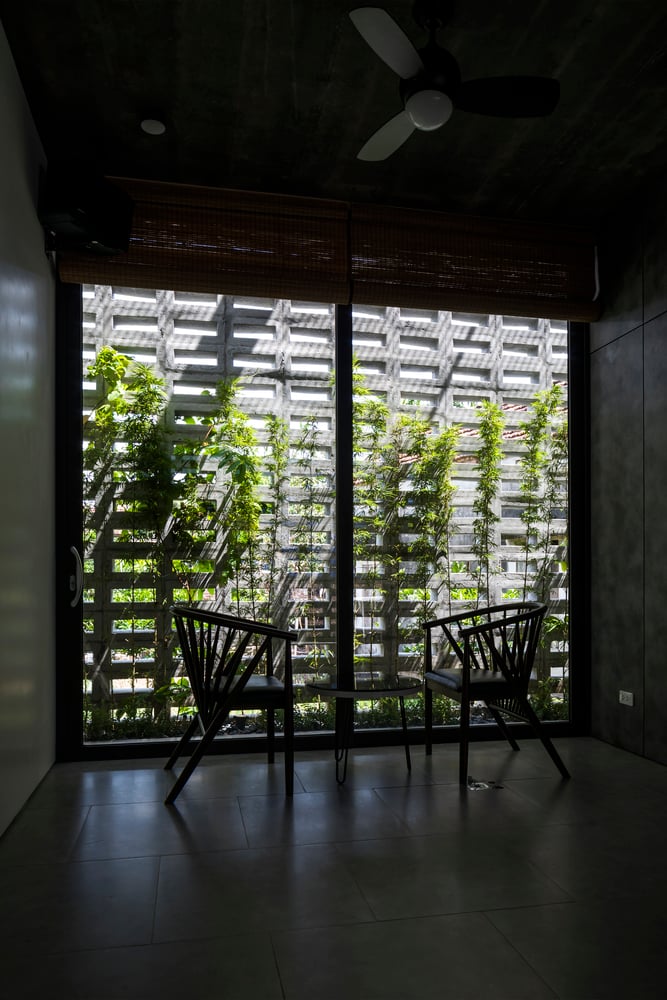 Đặc biệt, phần mái nhà được xử lý để cho phép nắng và mưa đi qua, khuyến khích cây cối phát triển hoàn toàn theo chu trình tự nhiên. Nhờ đó, khu vườn nhỏ trên mái không chỉ là điểm nhấn cảnh quan mà còn đóng vai trò như một lớp cách nhiệt thụ động, điều tiết khí hậu bên trong ngôi nhà.