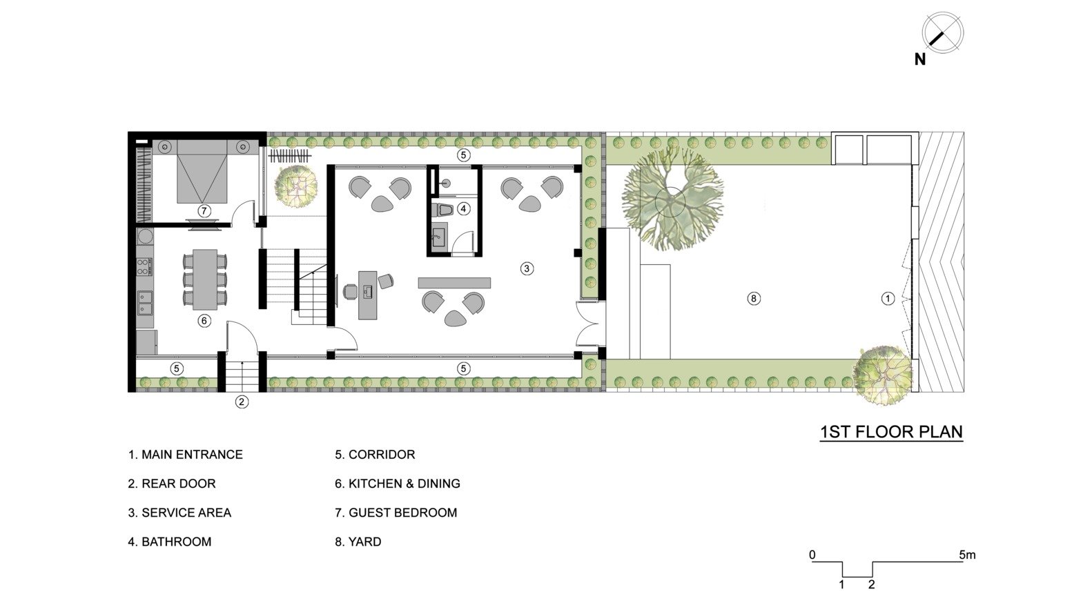 Để giải quyết thách thức này, nhóm thiết kế từ i.House Architecture and Construction đã quyết định dành 11m đầu khu đất làm sân trước – không chỉ là nơi đậu xe mà còn là khoảng đệm xanh giúp giảm tác động môi trường và tăng tính kết nối với thiên nhiên. Mảng sân này được phủ đầy cây cối, hoa cỏ bản địa để làm dịu sự thô ráp của vật liệu gạch, bê tông và tạo cảm giác thư thái cho gia chủ mỗi lần trở về nhà.
