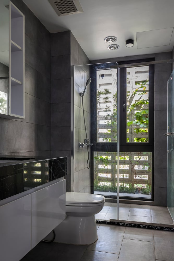 Hệ cửa kính toàn phần được ứng dụng ở nhiều khu vực trong nhà, cho phép ánh sáng đi sâu vào không gian nhưng vẫn kiểm soát được nhiệt độ – một lựa chọn khôn ngoan để giảm thiểu năng lượng nhân tạo. Nhờ những giải pháp này, ngôi nhà ở Đông Tảo đã trở thành minh chứng rõ nét cho xu hướng kiến trúc tiết chế – sống cùng thiên nhiên – tận dụng ánh sáng tự nhiên.