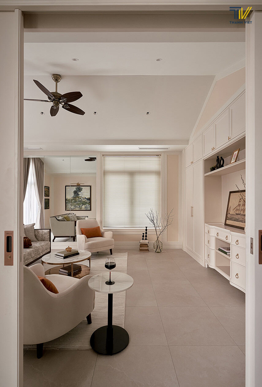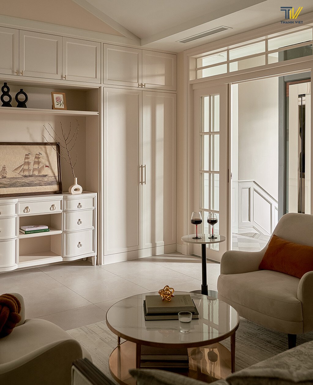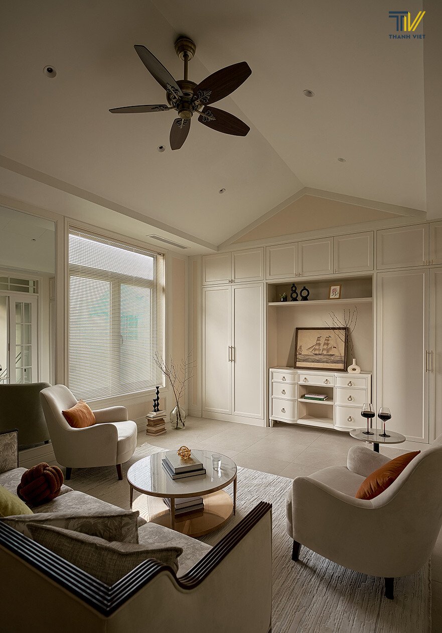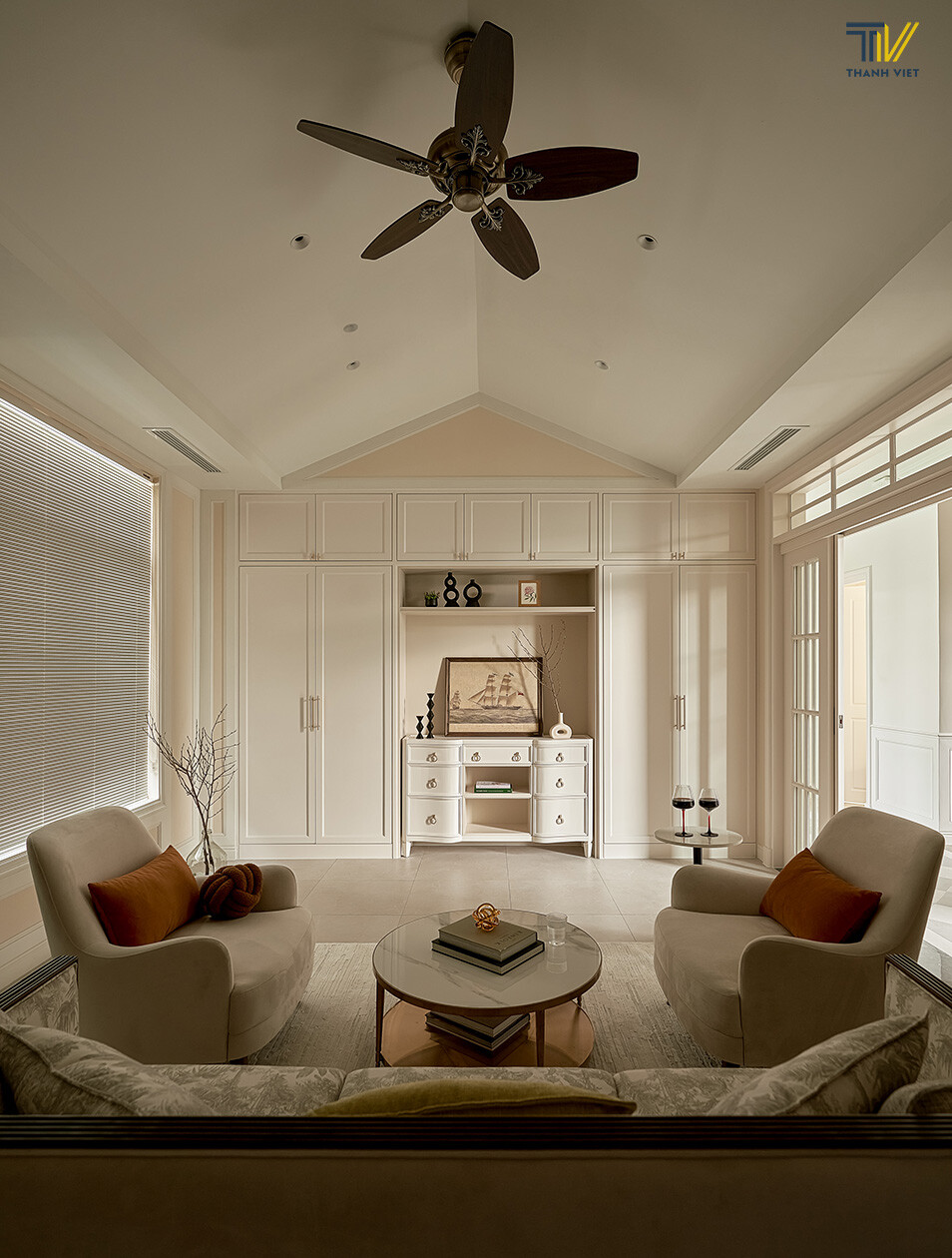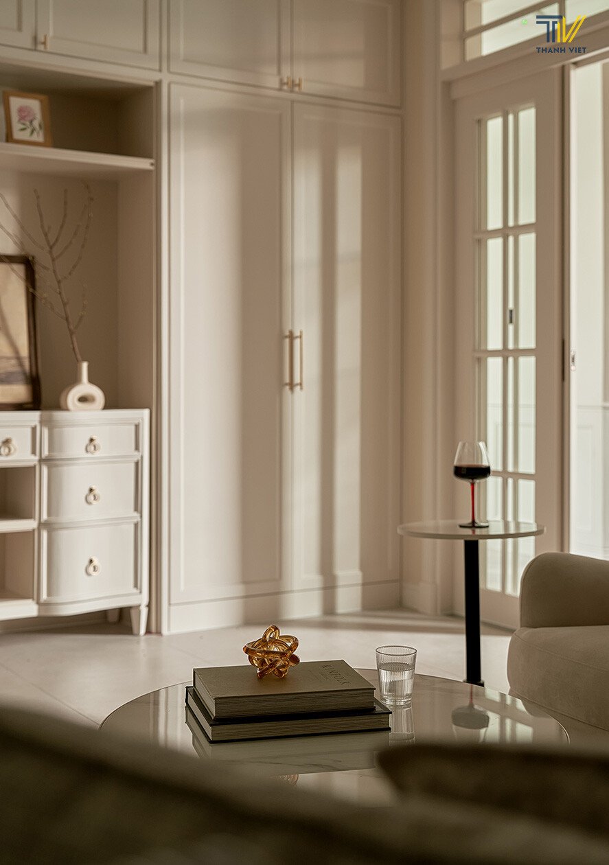 Đồ nội thất và décor trong phòng đều được đầu tư bài bản: từ sofa êm ái, ghế armchair tinh tế, đến bàn trà và các món đồ trang trí duyên dáng. Tất cả cùng hòa quyện tạo nên một tổng thể thanh lịch, tinh tế nhưng vẫn ấm áp và gần gũi.