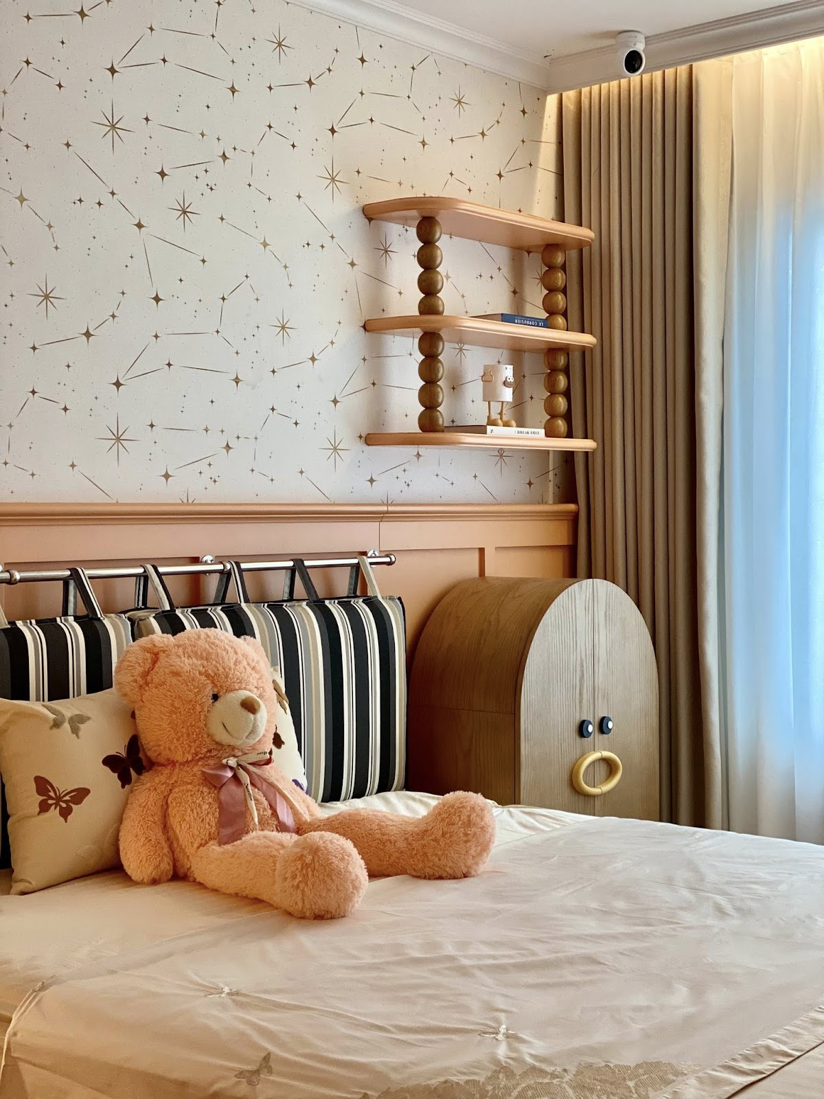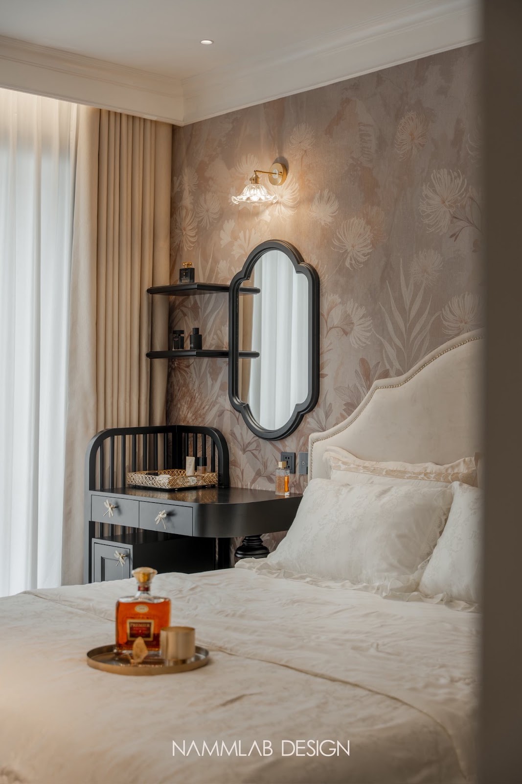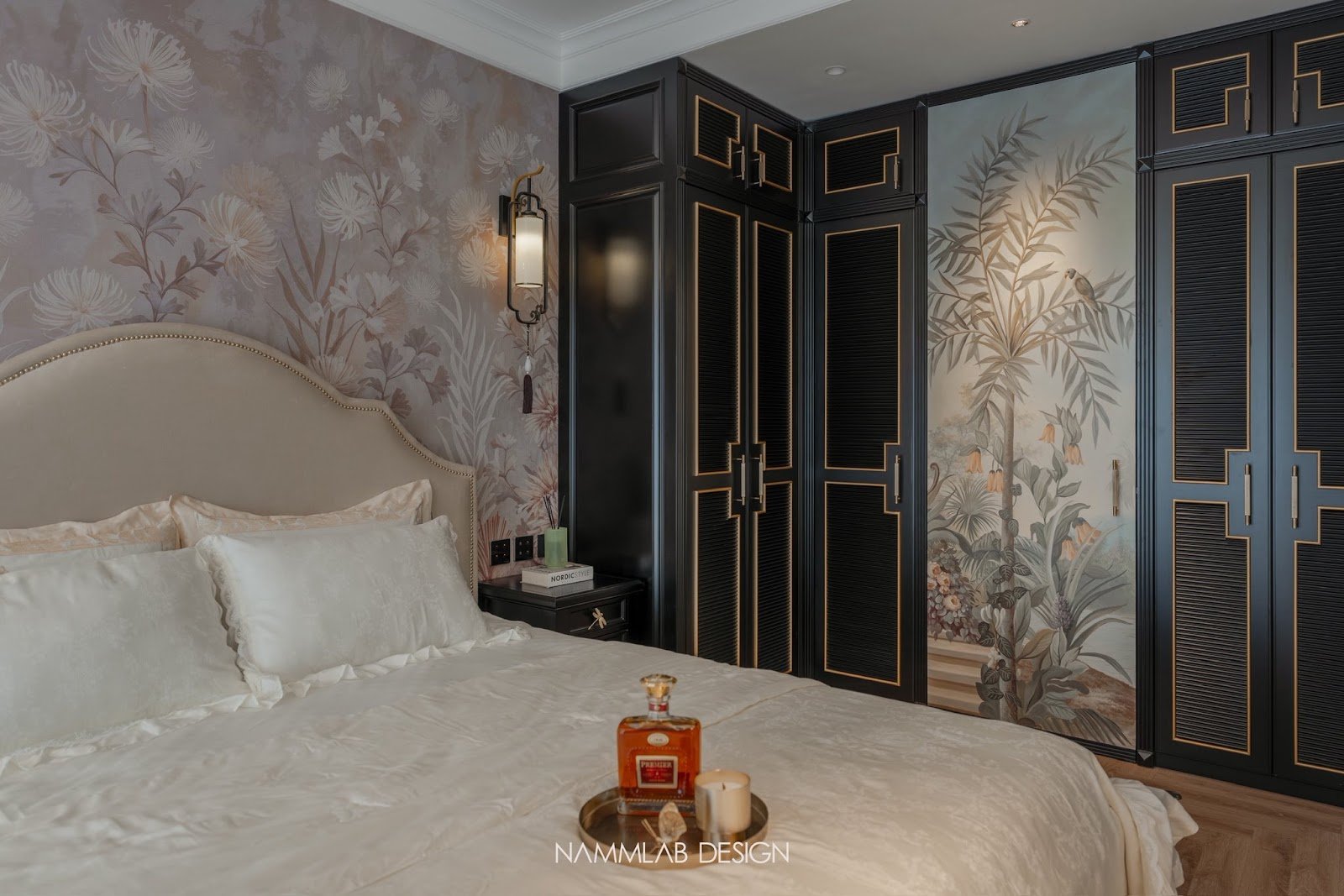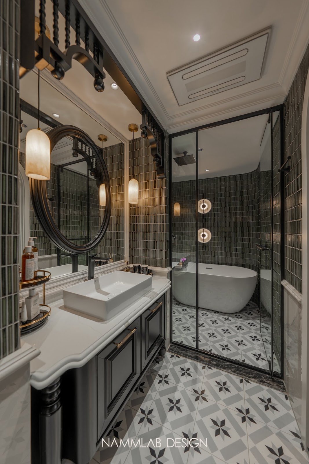 Phòng ngủ master sử dụng giấy dán tường hoa văn hoài cổ, tủ âm tường sơn đen kết hợp bức tranh lớn vẽ tay, thể hiện gu thẩm mỹ cao cấp. Phòng tắm mang đậm chất boutique hotel, với lavabo mặt đá, tường ốp gạch đứng xanh lục, gương tròn, ánh sáng ấm – tất cả hài hoà và đầy chi tiết. Khu spa có bồn sục lớn đặt giữa phòng, xung quanh là tiểu cảnh cây xanh và ánh sáng dịu – một lựa chọn đắt giá cho lối sống chậm, tận hưởng.