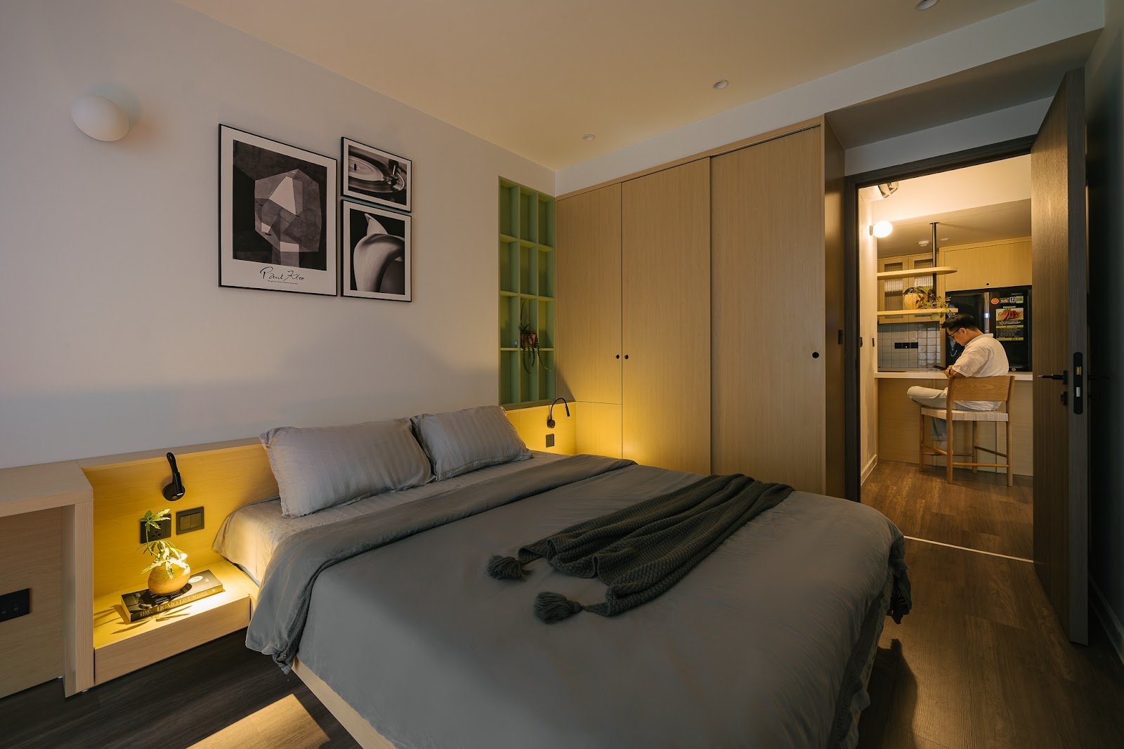 Một điểm nhấn thú vị là kệ trang trí âm tường sơn xanh ngay đầu giường – gợi nhớ đến chi tiết kệ trưng bày trong các căn hộ Nhật truyền thống, vừa có tính thẩm mỹ vừa tạo cảm giác sống động, cá nhân hóa không gian nghỉ ngơi.