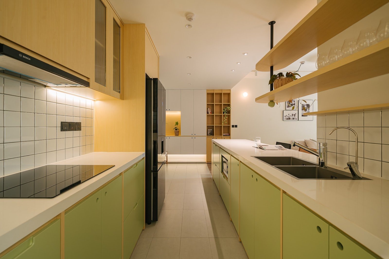 Hệ tủ bếp tối giản với gam xanh olive dịu mắt, kết hợp kệ mở và gạch ốp vuông tạo điểm nhấn mang hơi hướng Nhật Bản