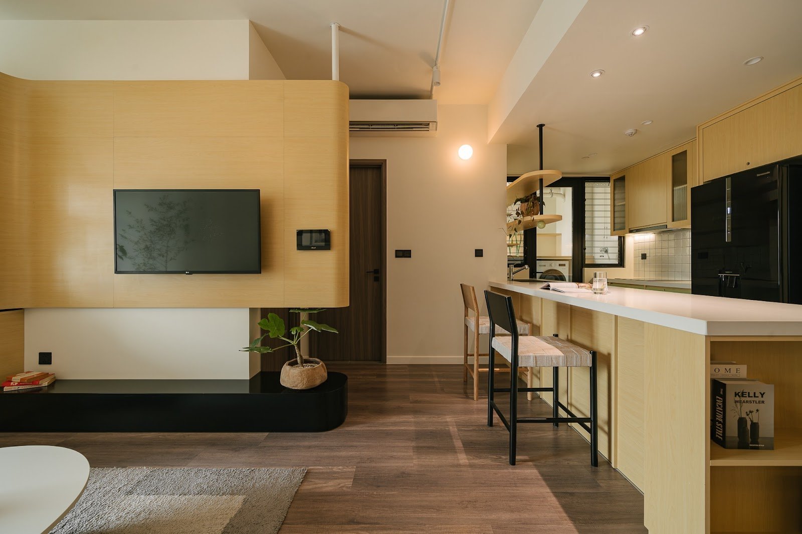 Tường cong ốp gỗ sáng kết hợp kệ mở tạo điểm nhấn thẩm mỹ, kết nối nhẹ nhàng giữa khu vực tiếp khách và không gian sinh hoạt chung