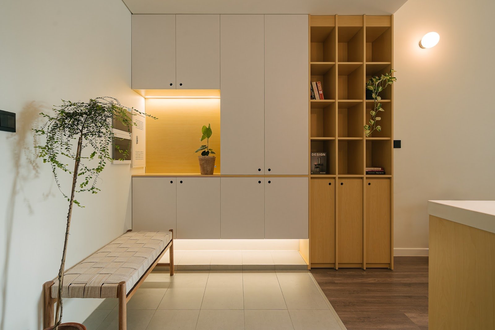 Không gian sống 58m2 được thiết kế theo phong cách tối giản hiện đại, lấy cảm hứng từ nội thất Nhật Bản kết hợp cùng hơi hướng retro nhẹ nhàng, tạo nên tổng thể hài hòa, tiện nghi và đầy cảm xúc.
