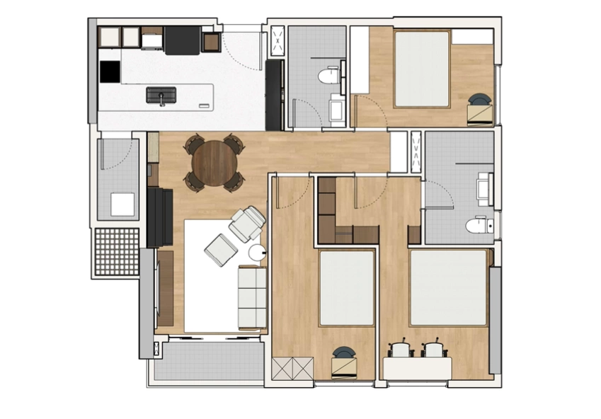 Căn hộ nằm tại Thủ Đức, TP.HCM, có diện tích 100m2 với bố cục gồm 3 phòng ngủ, 2 phòng vệ sinh, phòng khách – bếp liên thông và một ban công nhiều ánh sáng. Chủ nhà – một người trẻ yêu thích phong cách sống gọn gàng, tinh tế – đã lựa chọn thi công toàn bộ nội thất theo tinh thần tối giản và hướng Nhật Bản.
