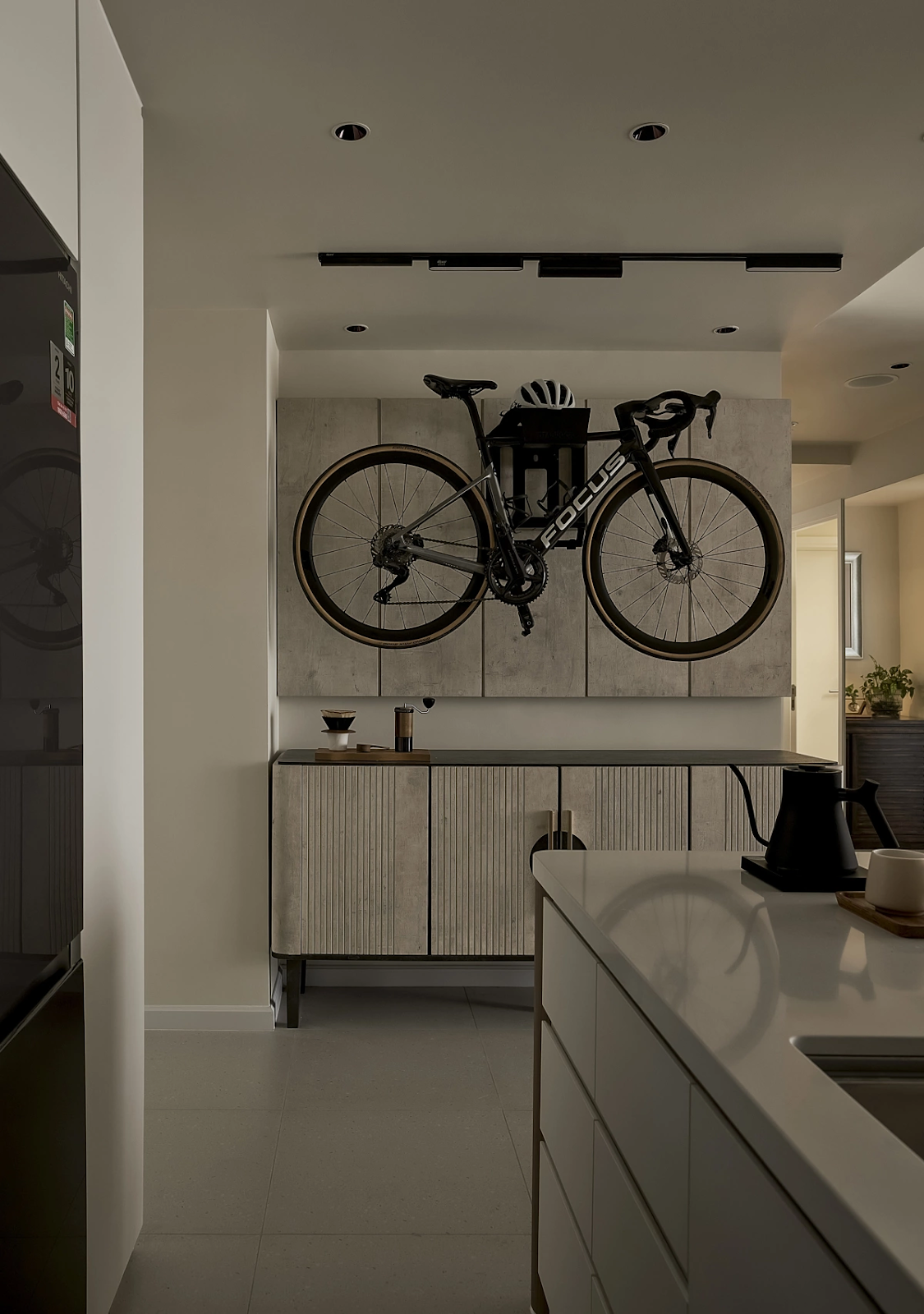 Ngay từ cửa ra vào, người ta dễ dàng nhận ra đây không phải là một căn hộ phổ thông. Chiếc xe đạp treo tường được đặt như một “tuyên ngôn cá nhân” – không chỉ vì tính thẩm mỹ mà còn vì sự gắn bó đặc biệt của gia chủ với bộ môn thể thao này. Phía dưới là hệ tủ giày gỗ thông phủ dầu, tạo cảm giác thô mộc nhưng ấm cúng, ăn nhập với toàn bộ tông màu gỗ sồi nhạt chủ đạo.