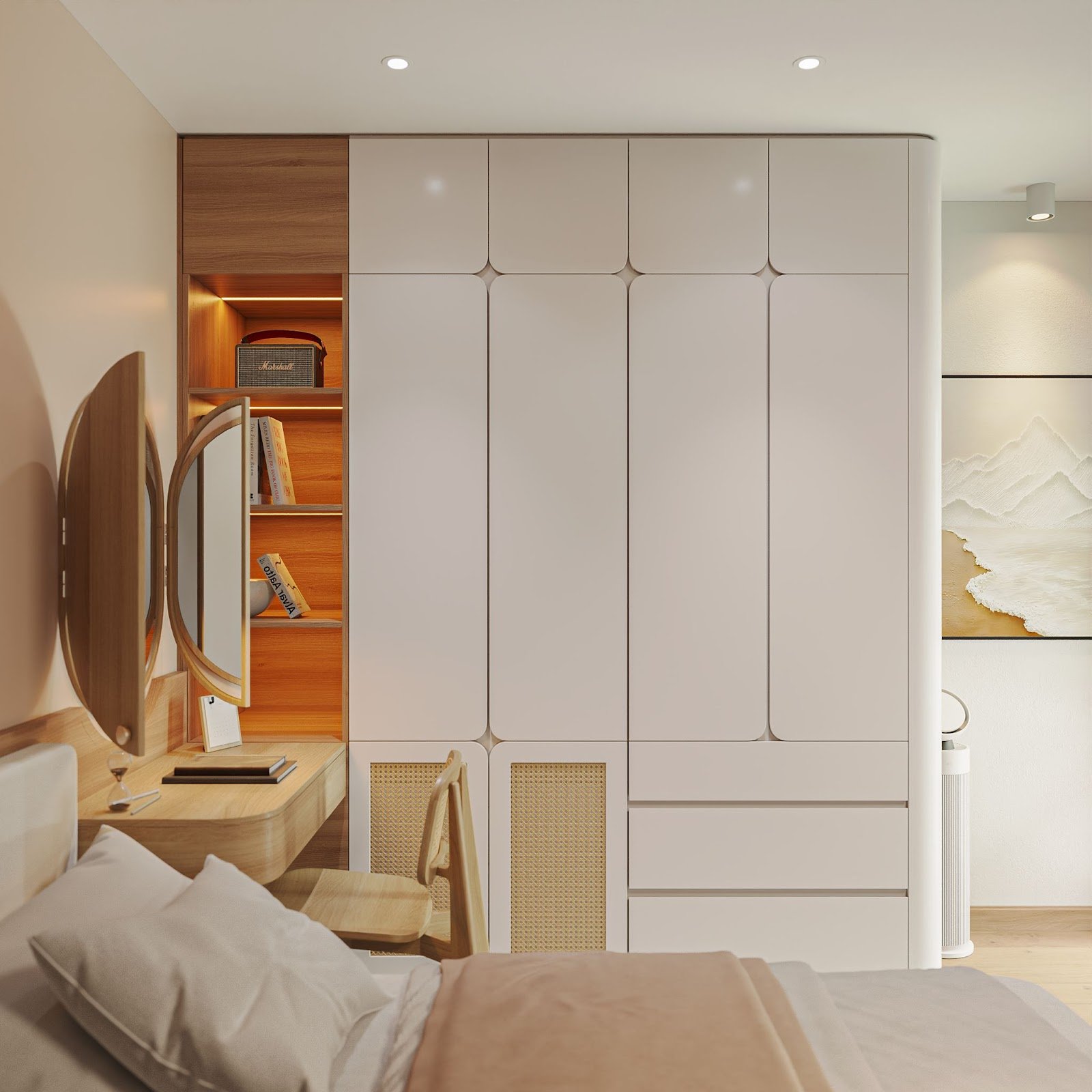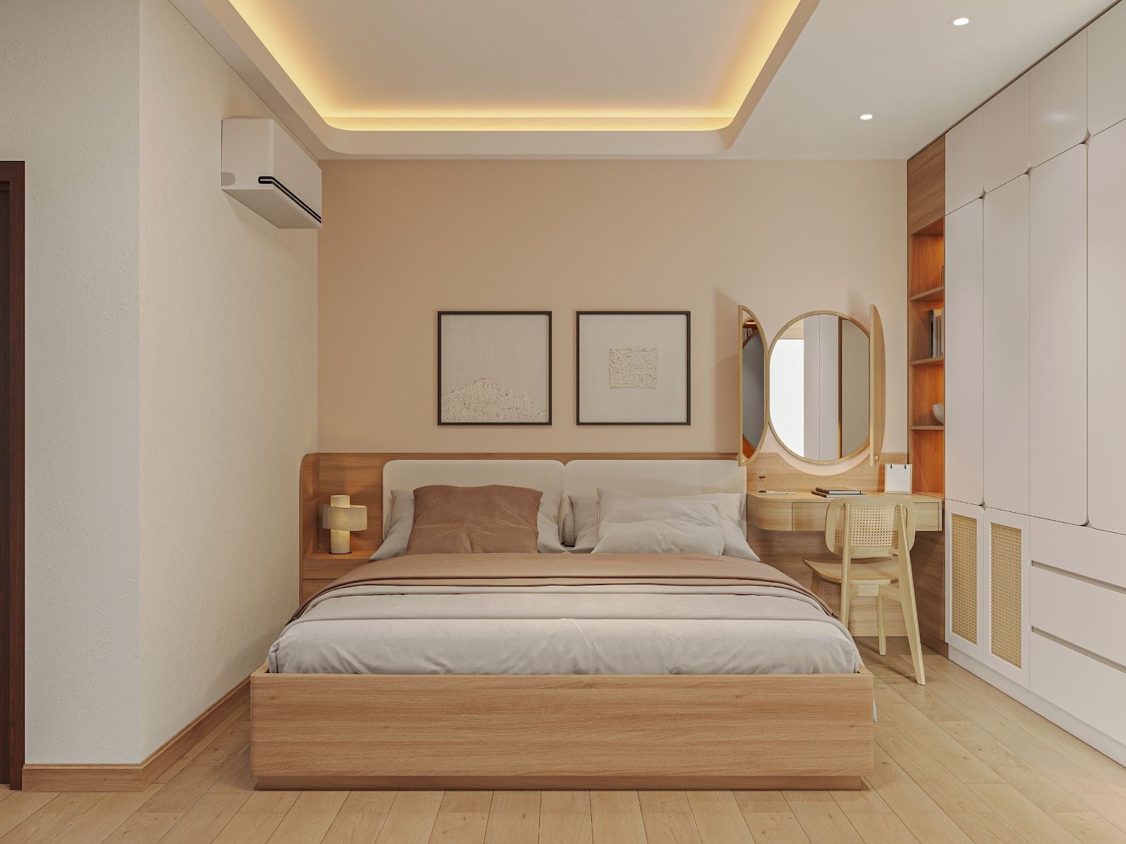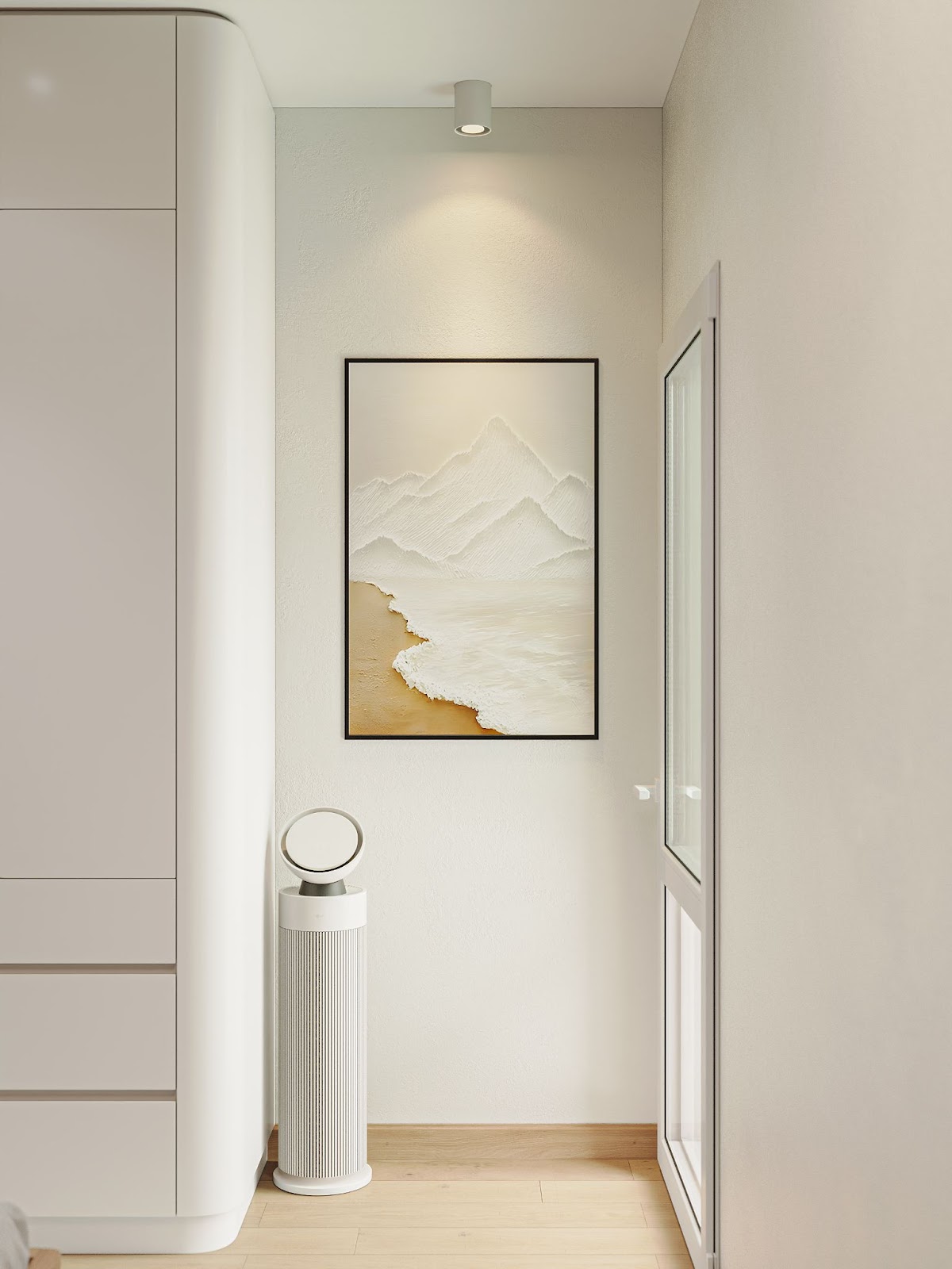 Phương án giải quyết đến từ việc bố trí nội thất khéo léo, loại bỏ những chi tiết rườm rà, tận dụng từng khoảng trống để tạo không gian để đồ mà không làm ngôi nhà bị bí bách. Gam màu trung tính như trắng, be, gỗ sáng được sử dụng xuyên suốt để tạo cảm giác nhẹ nhàng, mở rộng thị giác. Những đường nét tối giản nhưng sắc sảo, cộng hưởng cùng ánh sáng tự nhiên từ cửa kính lớn, giúp căn hộ luôn giữ được vẻ tinh tươm, thư thái.