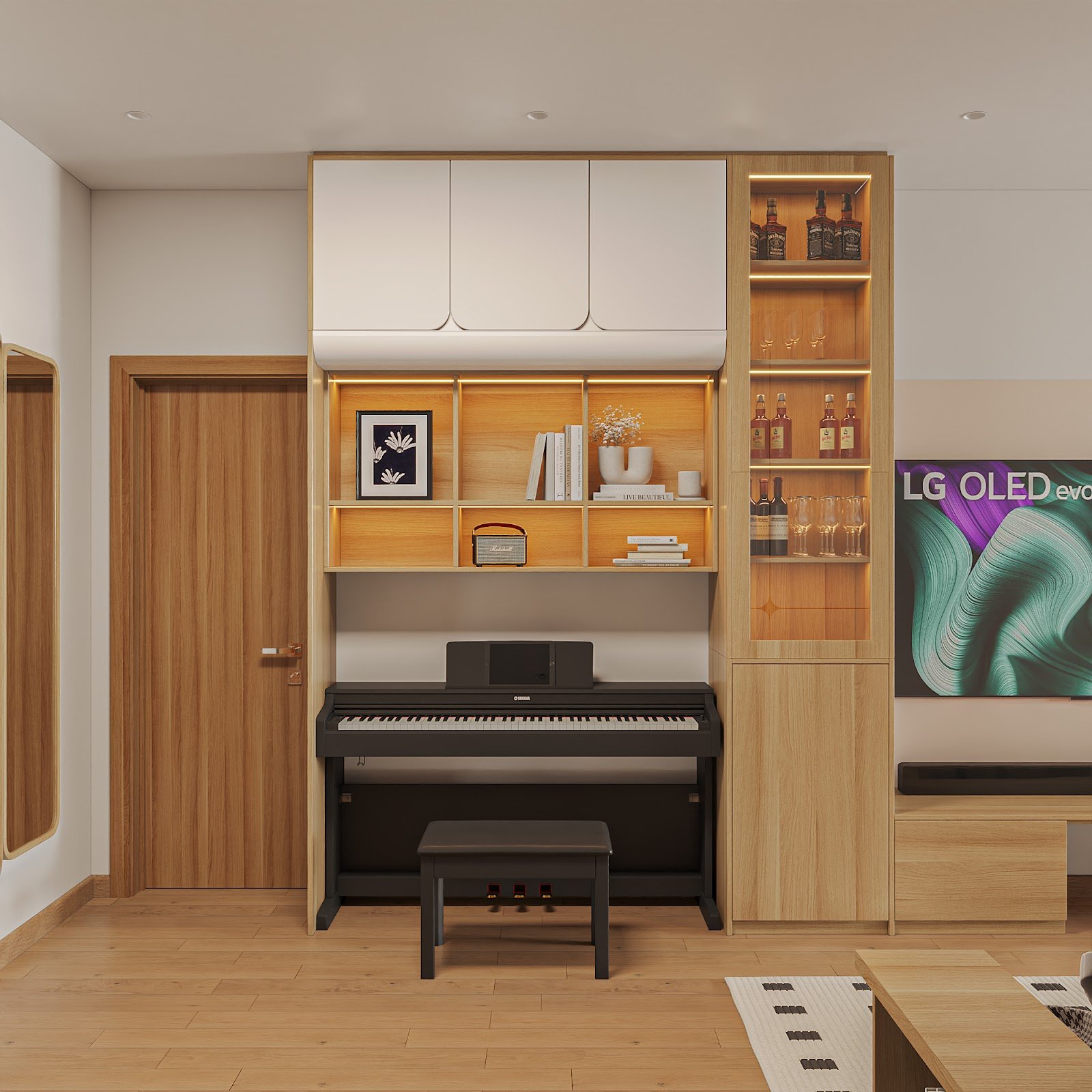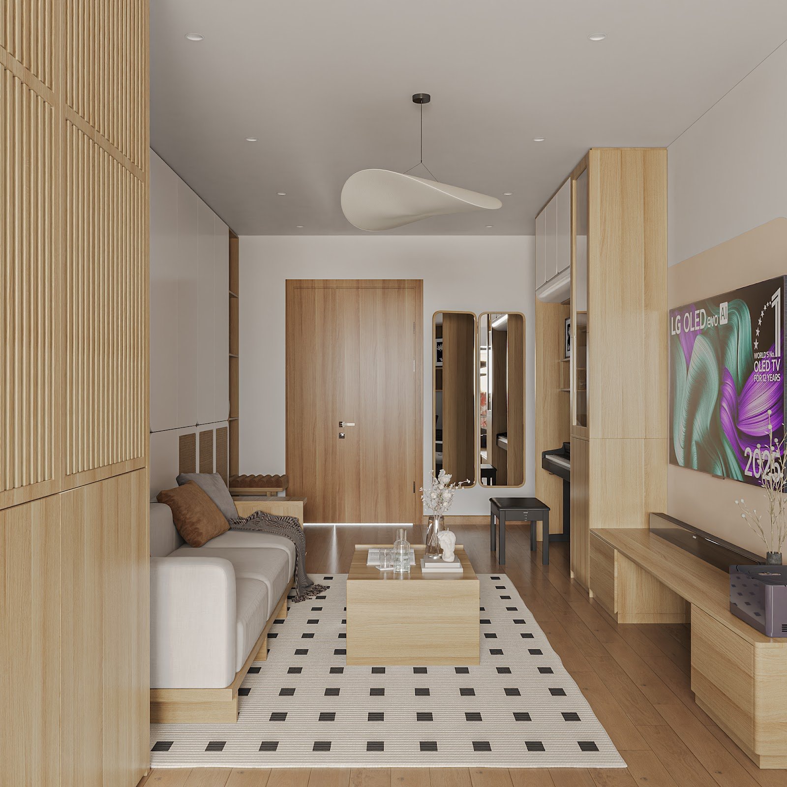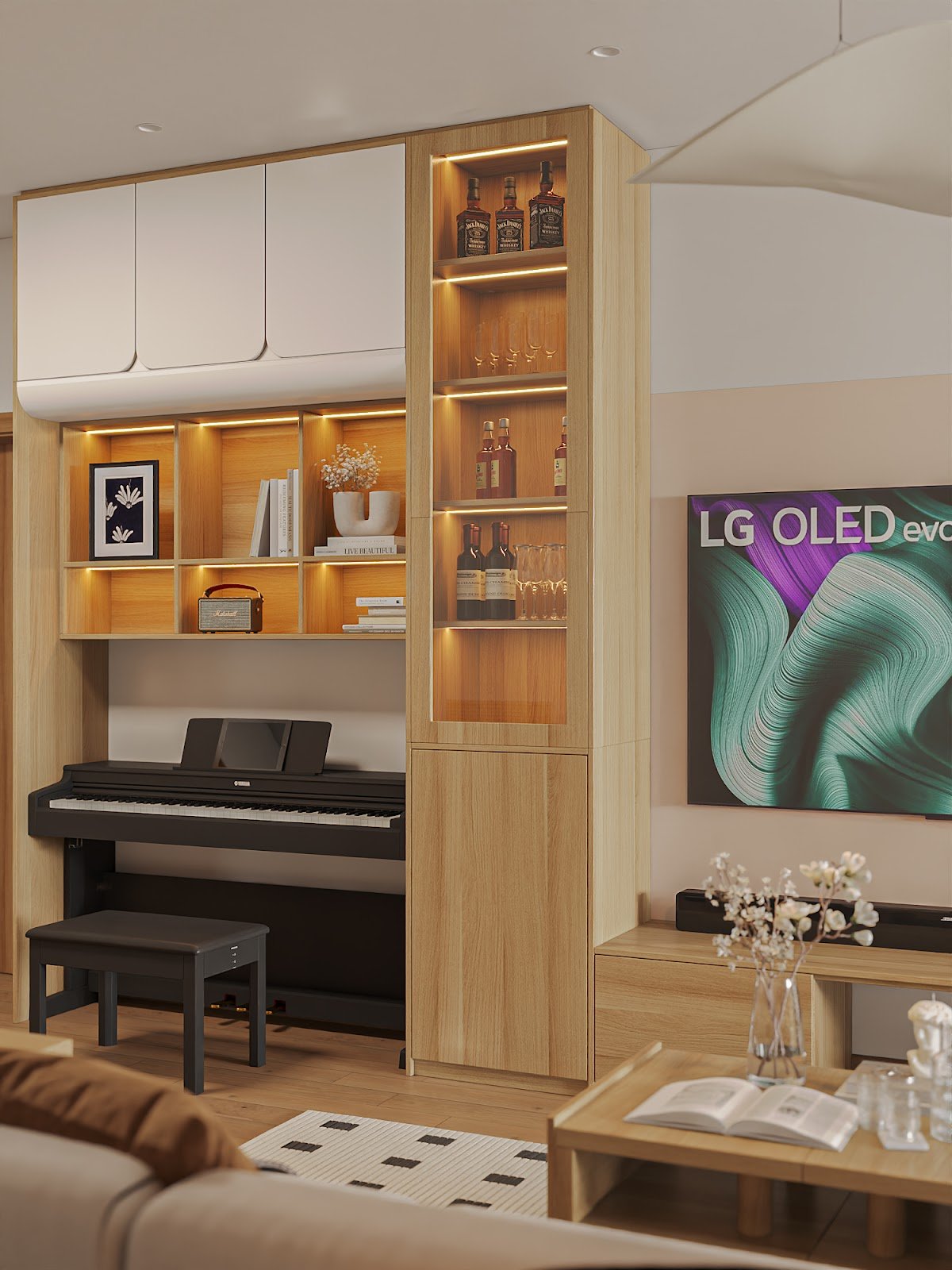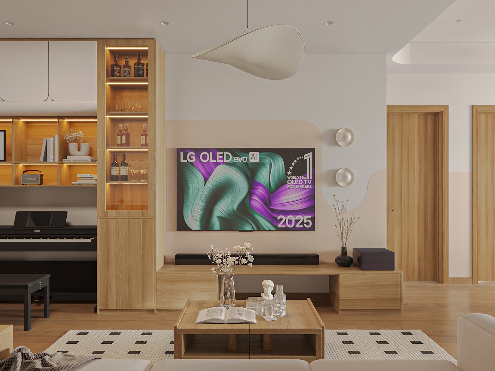 LG OLED TV là điểm nhấn công nghệ trong không gian sinh hoạt chung. Với thiết kế siêu mỏng, khung viền tinh giản và công nghệ hình ảnh chân thực, chiếc TV này mang đến trải nghiệm xem phim như rạp chiếu tại nhà, mà vẫn hài hòa với phong cách nội thất Japandi.