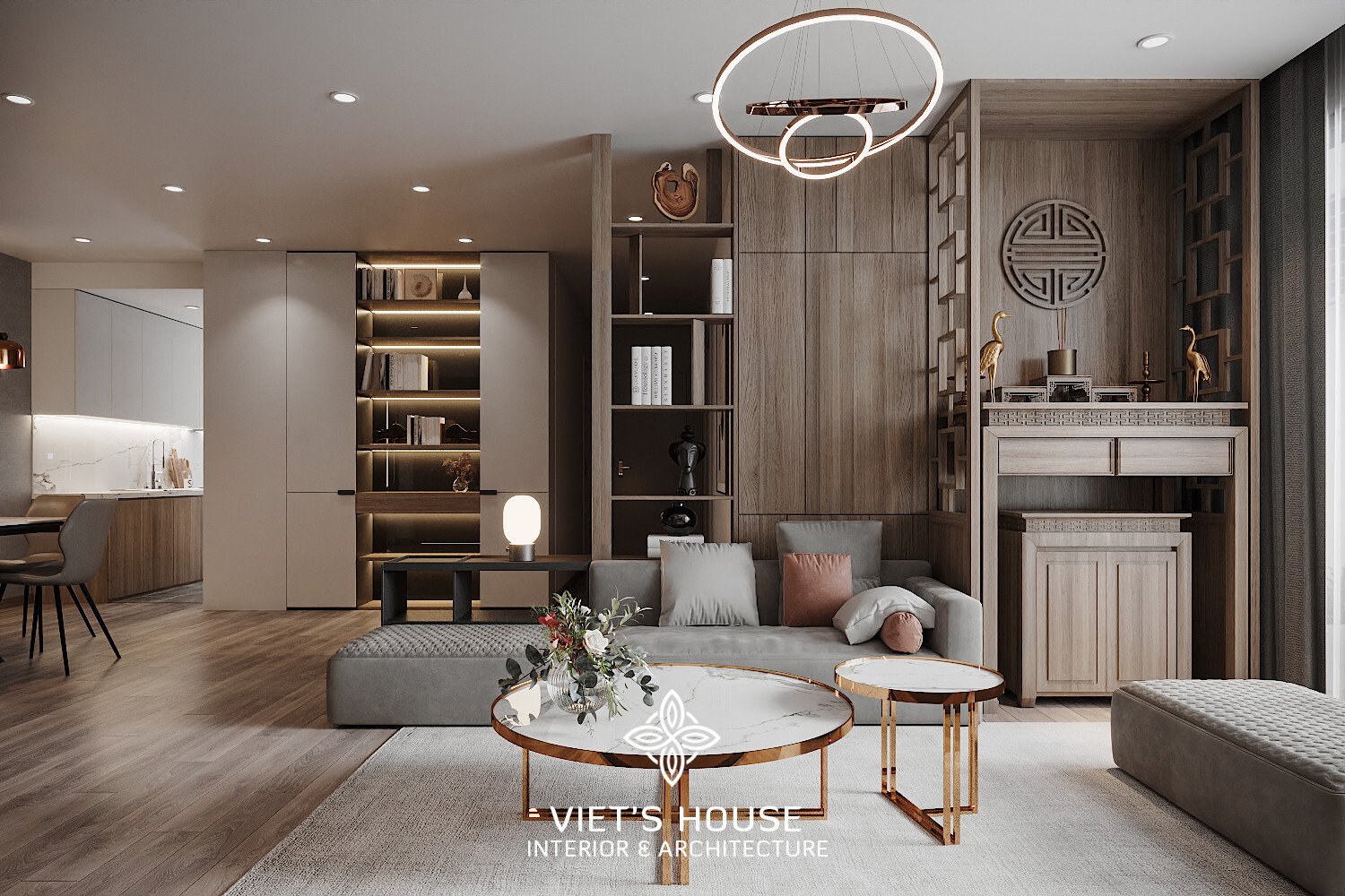 Khu vực thờ cúng được bố trí trang trọng với hệ gỗ tự nhiên, vừa tôn nghiêm vừa hòa hợp cùng phòng khách.