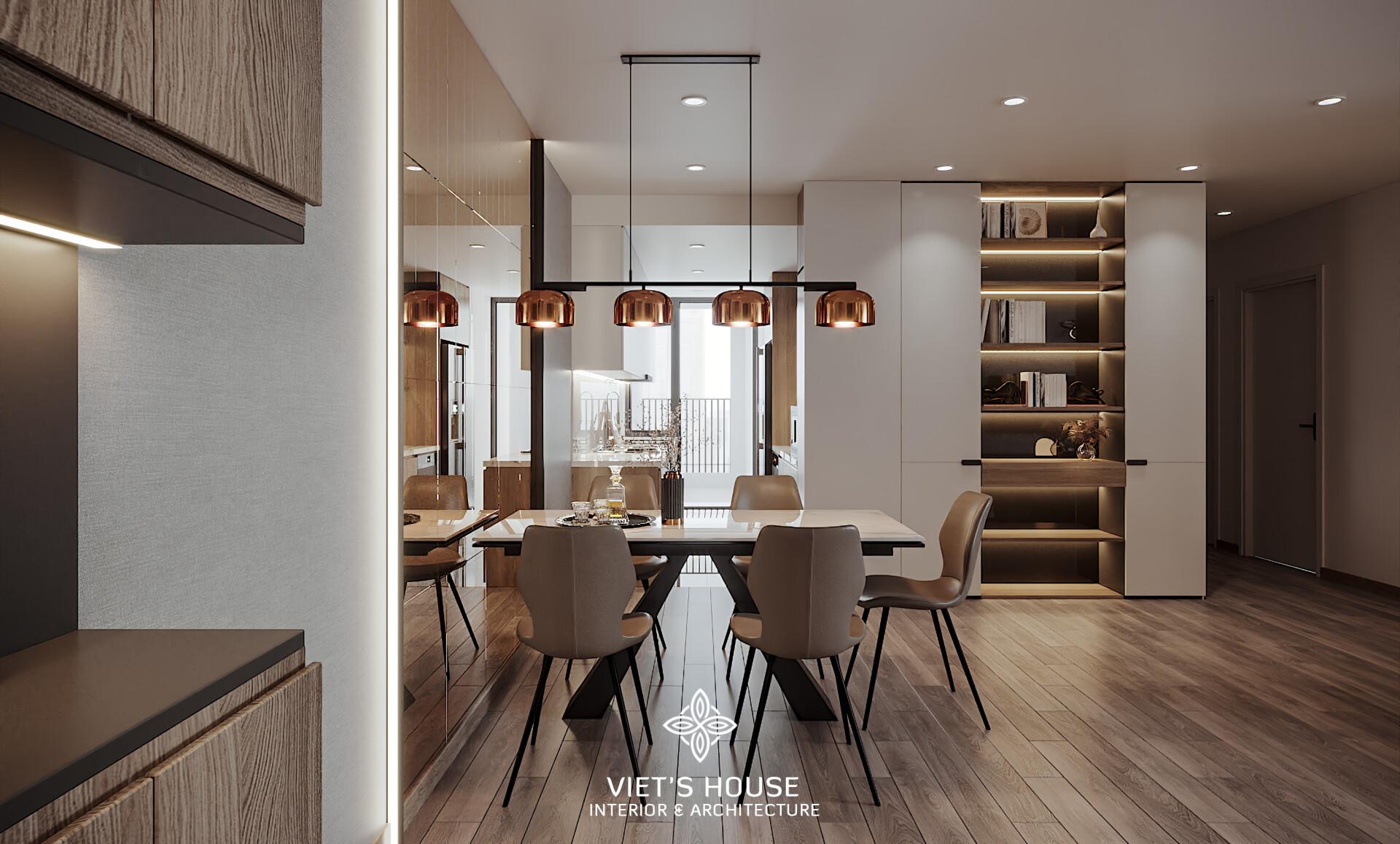 Bộ bàn ăn 6 ghế thanh lịch, nổi bật với đèn thả trần màu đồng ánh kim, cùng hệ gương phản chiếu giúp mở rộng không gian.