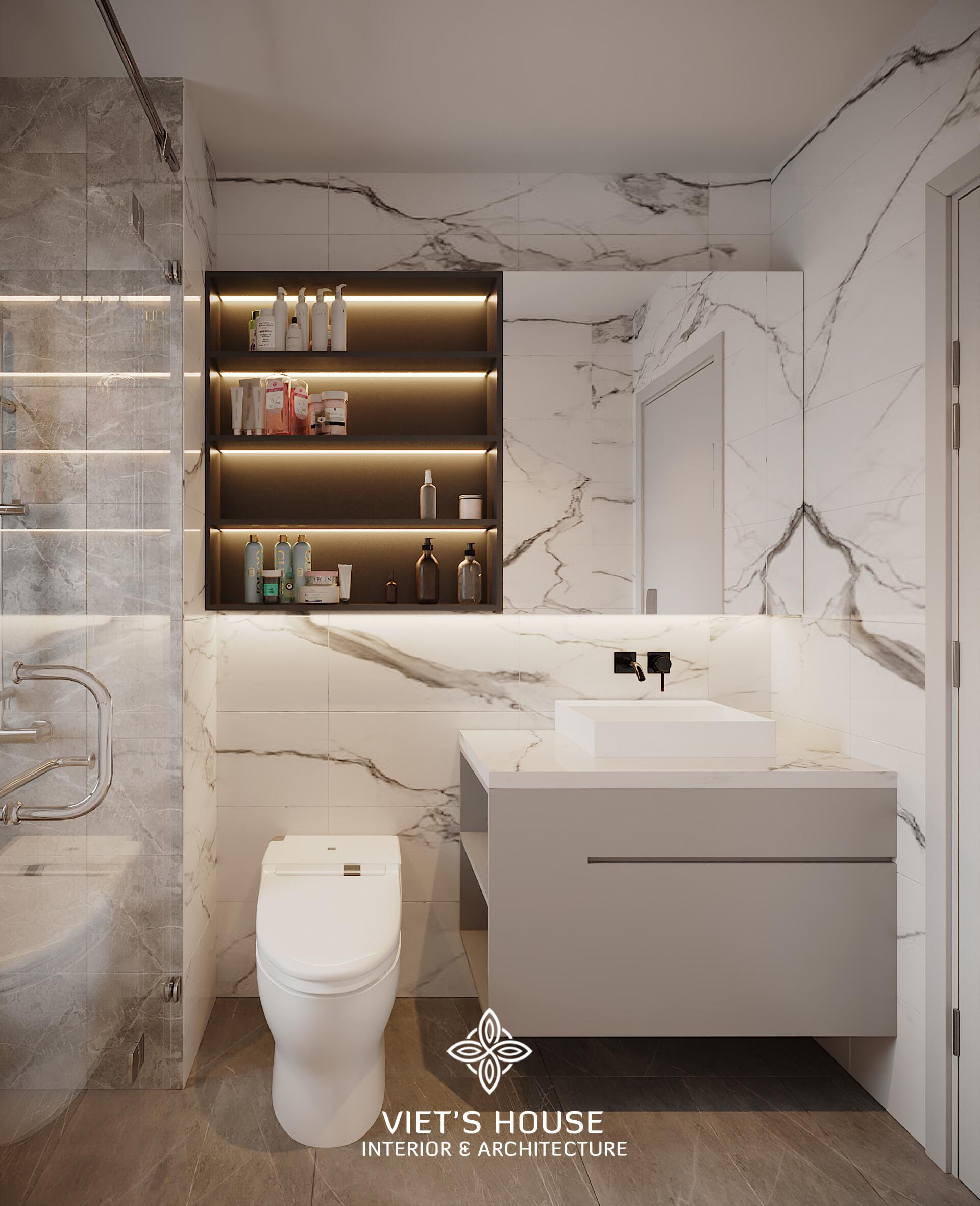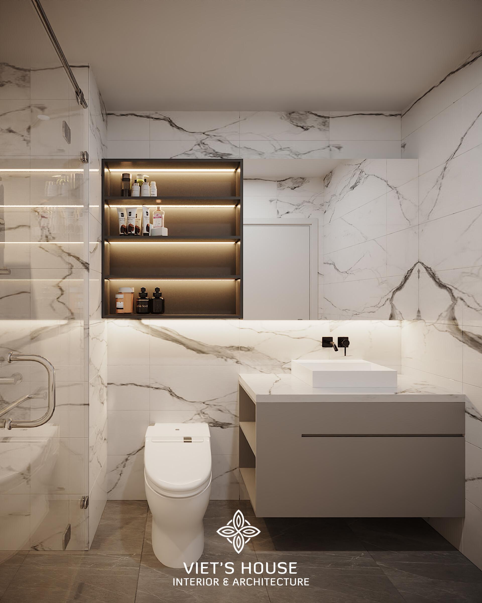 Phòng tắm ốp đá marble trắng vân xám, lavabo treo, kệ âm tường hắt sáng sang trọng.