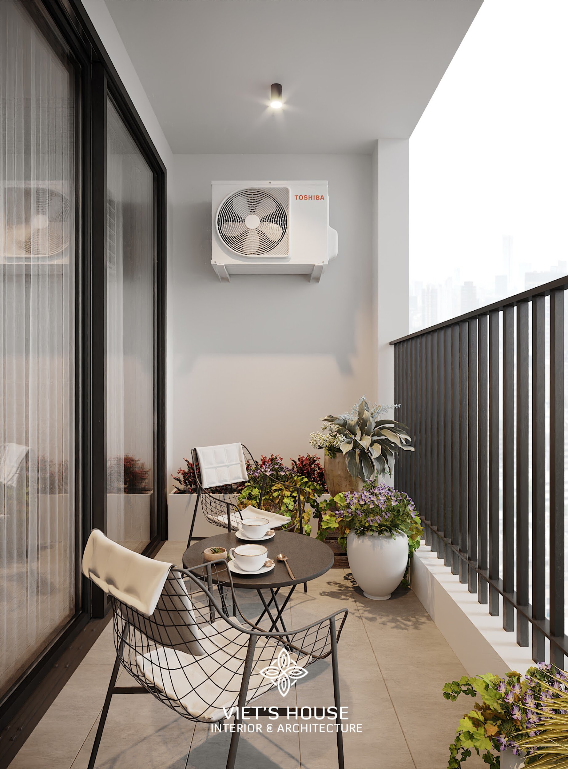 Ban công xanh mát với cây xanh và bàn trà nhỏ là góc thư giãn đầy thi vị. Đây chính là nơi đôi vợ chồng trẻ tìm sự cân bằng, để hít thở không khí trong lành và để ý tưởng sáng tạo có thêm những chất liệu mới.