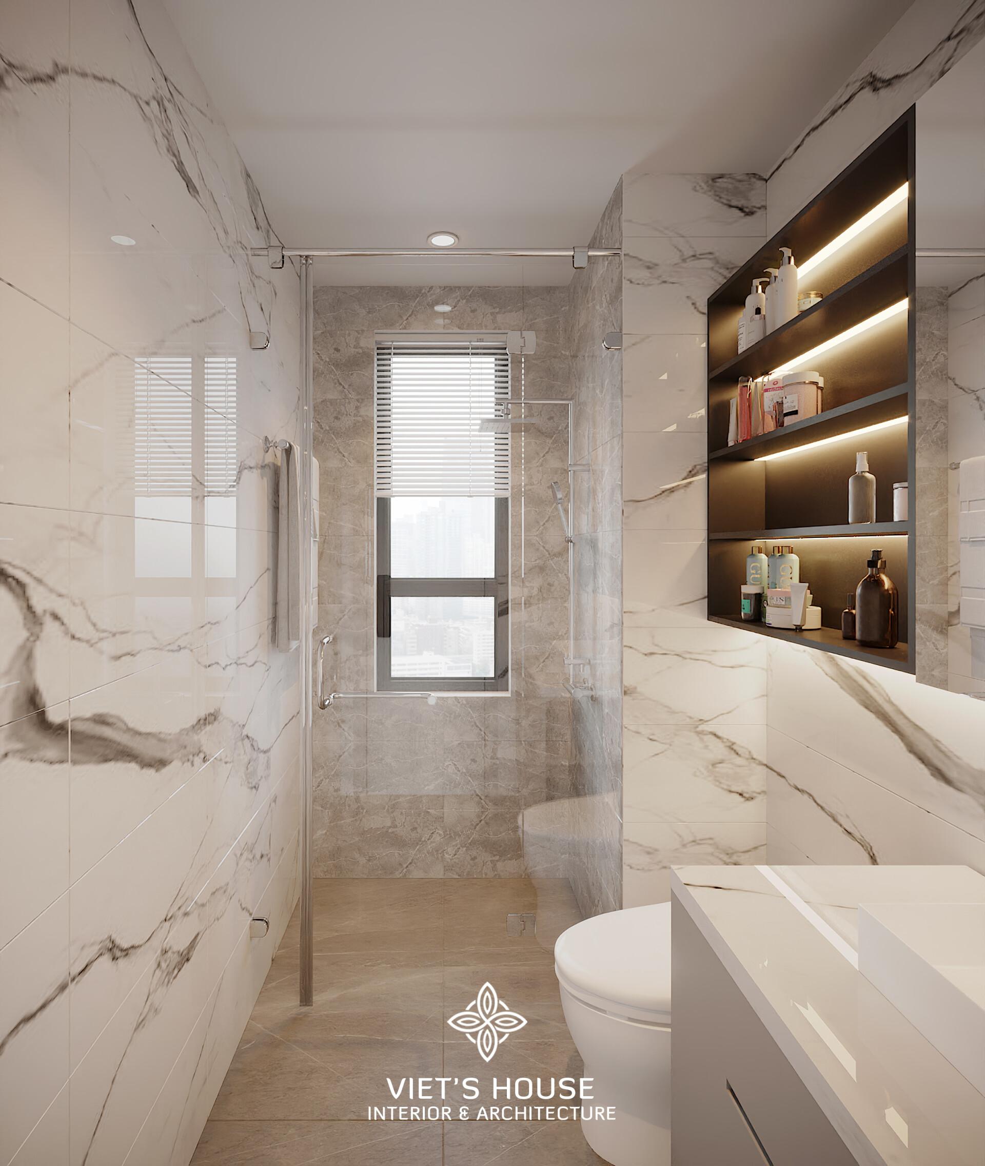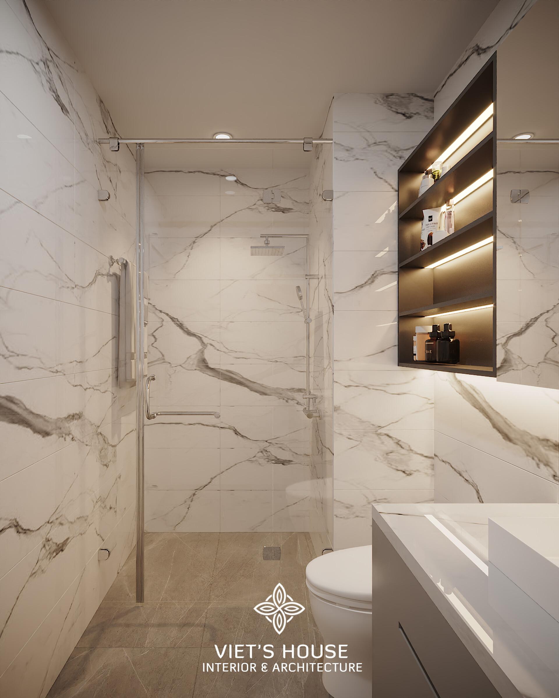 Phòng tắm ốp đá marble trắng vân mây, kết hợp ánh sáng hắt và khu tắm kính sang trọng. Sự phối hợp của đá, kính và ánh sáng khiến không gian nhỏ trở nên đẳng cấp, giúp gia chủ thư giãn và làm mới bản thân sau một ngày dài.