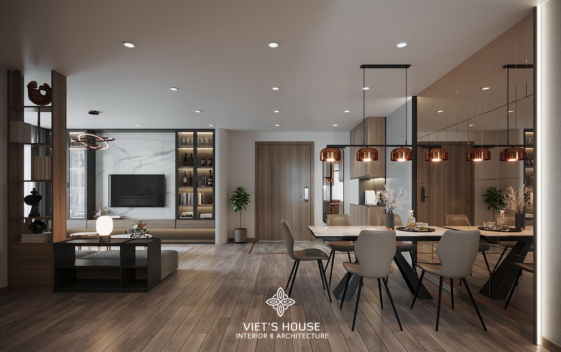 Không gian mở liền mạch kết nối phòng khách, bàn ăn và bếp tạo nên nhịp sống gắn kết. Hệ tủ rượu sang trọng, bàn ăn dài 6 ghế và đèn thả ánh kim trở thành điểm nhấn, lý tưởng cho những bữa cơm gia đình hay buổi gặp gỡ bạn bè. Sofa chữ I kết hợp bàn trà đá tròn viền ánh kim và mảng tường ốp đá marble trắng mang lại sự sang trọng nhưng không kém phần ấm áp.