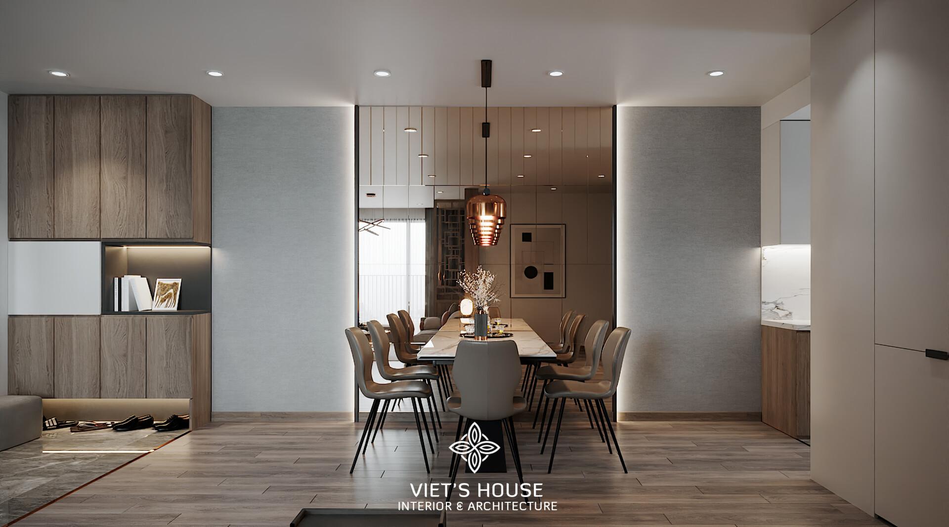 Thiết kế dành cho nhiều thành viên, đèn thả hiện đại kết hợp mảng tường gương kéo dài, làm nổi bật sự sang trọng.