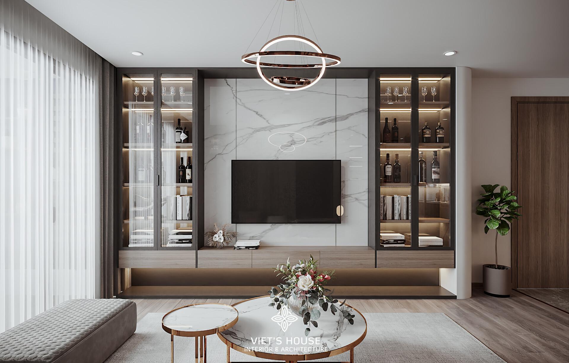 TV treo tường ốp đá marble trắng, kết hợp tủ kính trưng bày rượu và phụ kiện trang trí, gợi lên sự sang trọng và đẳng cấp.