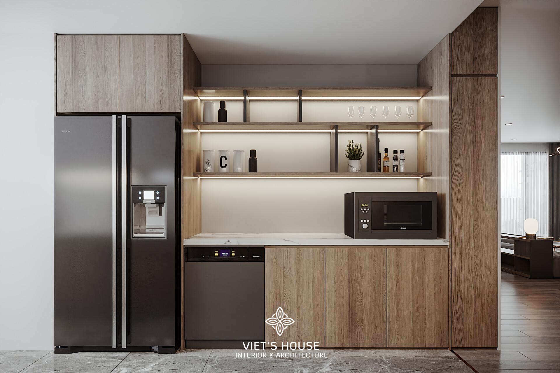 Tích hợp tủ lạnh, lò vi sóng và máy rửa bát trong hệ tủ gỗ hiện đại, mang đến sự tiện nghi và tối ưu công năng.