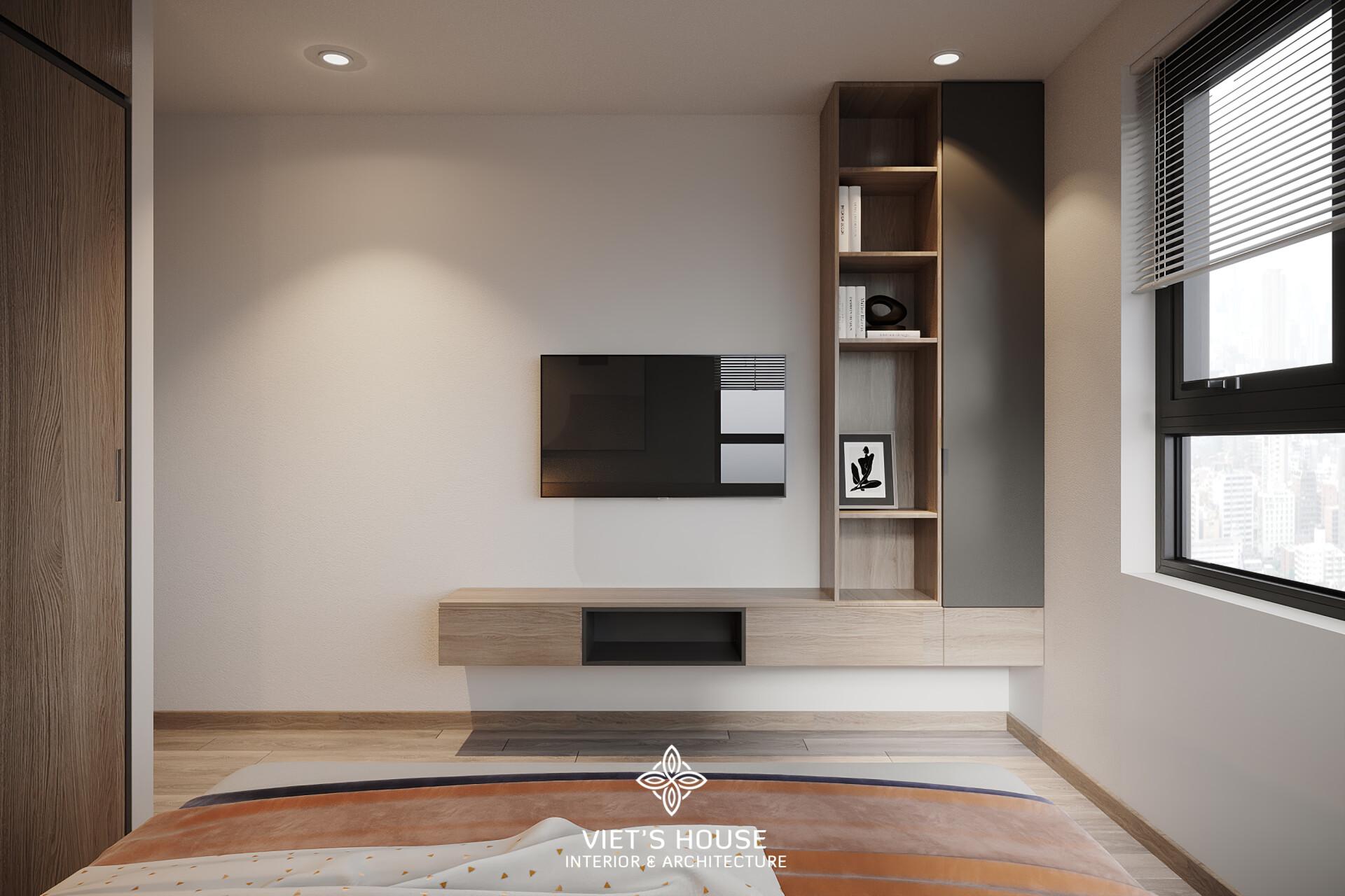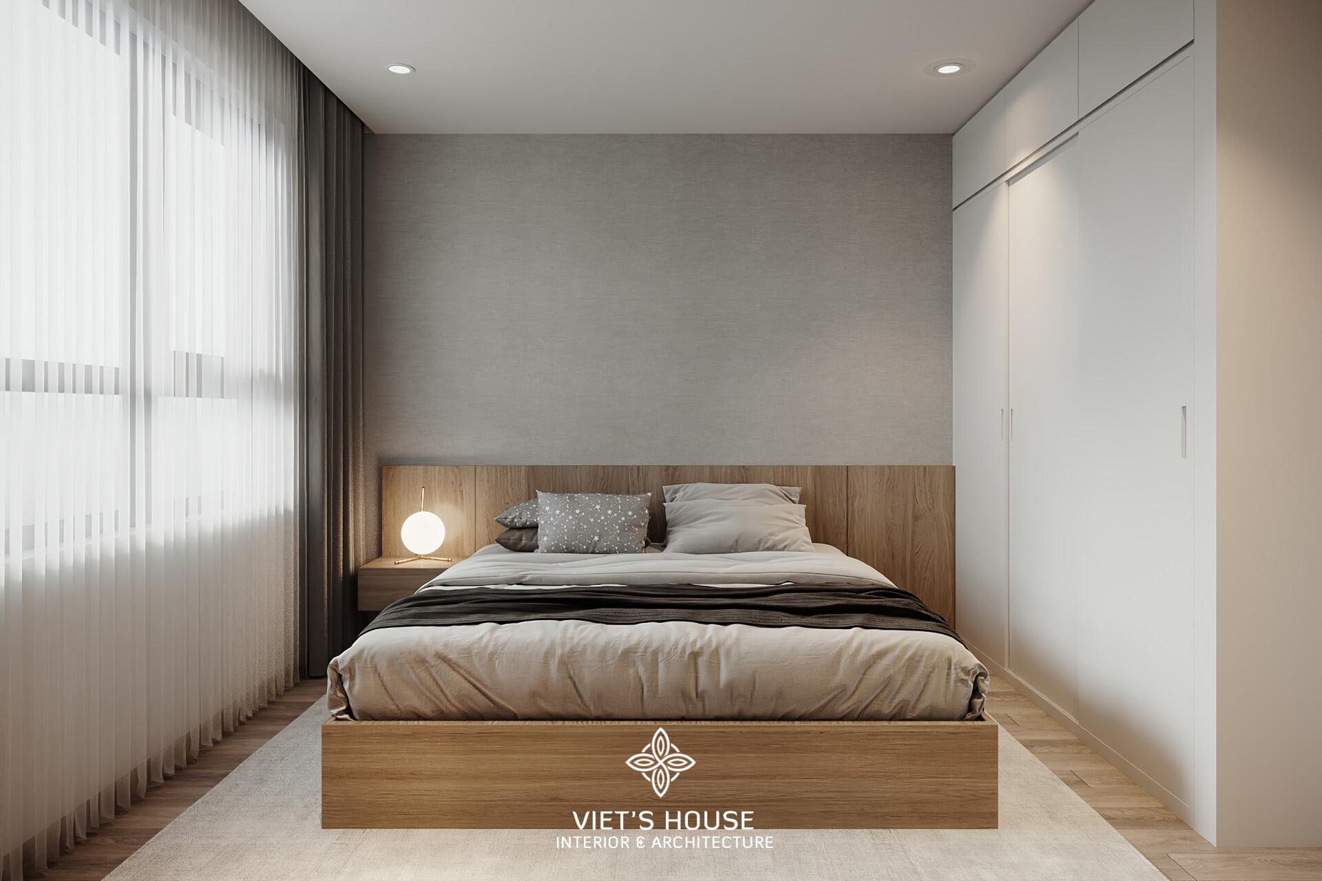 Phòng ngủ master với tone màu trầm kết hợp gỗ tự nhiên và cửa sổ lớn đón sáng mang lại sự thư thái cho phòng ngủ master. Giường bọc nệm be, chăn ga tối giản cùng hệ tủ âm tường rộng rãi tạo nên một không gian riêng tư, thoải mái – hoàn hảo cho giấc ngủ sâu và năng lượng mới.